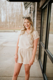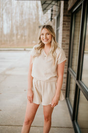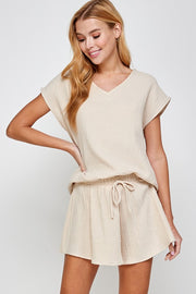 Cotton gauze top and shorts set V neck cap sleeve top High waisted flowy shorts Spaghetti tie detail on waistband Elastic in waistband for comfortable fit Solid woven cotton gauze fabric