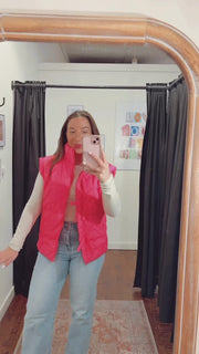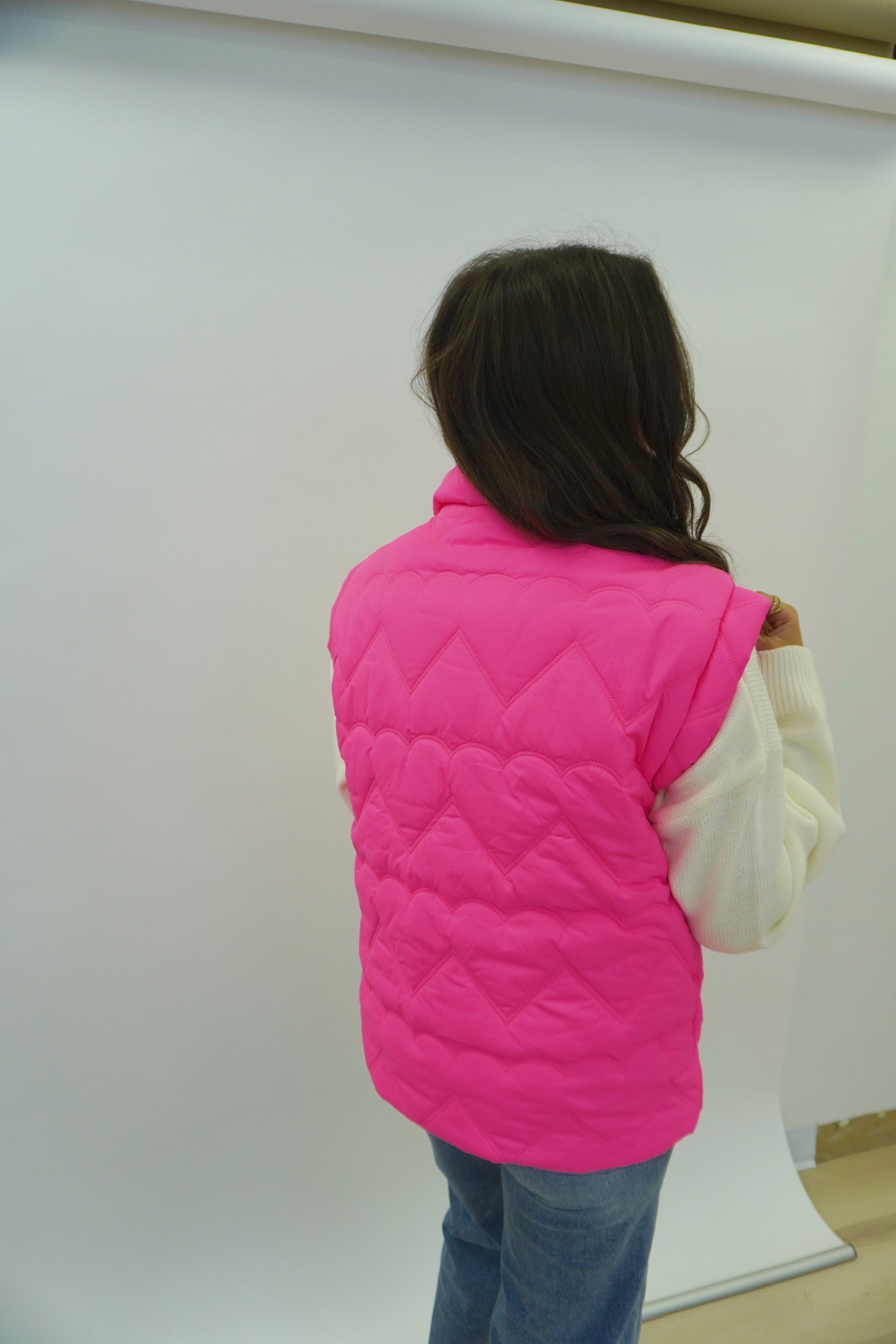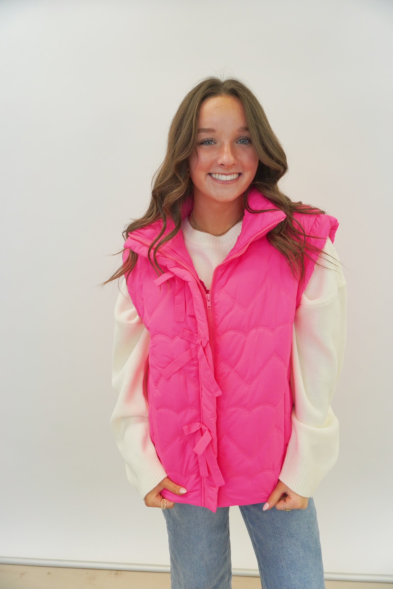 Get cozy with Beth- the Heart Quilt Stitch Bow Details Zipper Puffer Vest! Oversized for comfort, this hot pink vest is perfect for layering and features adorable heart-shaped stitching and bow details. Stay stylish and warm with this piece!