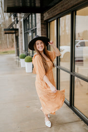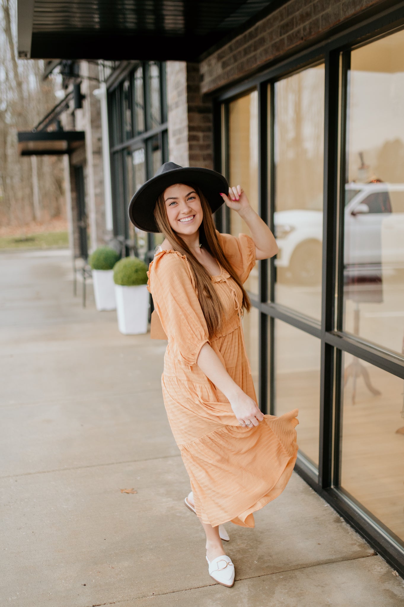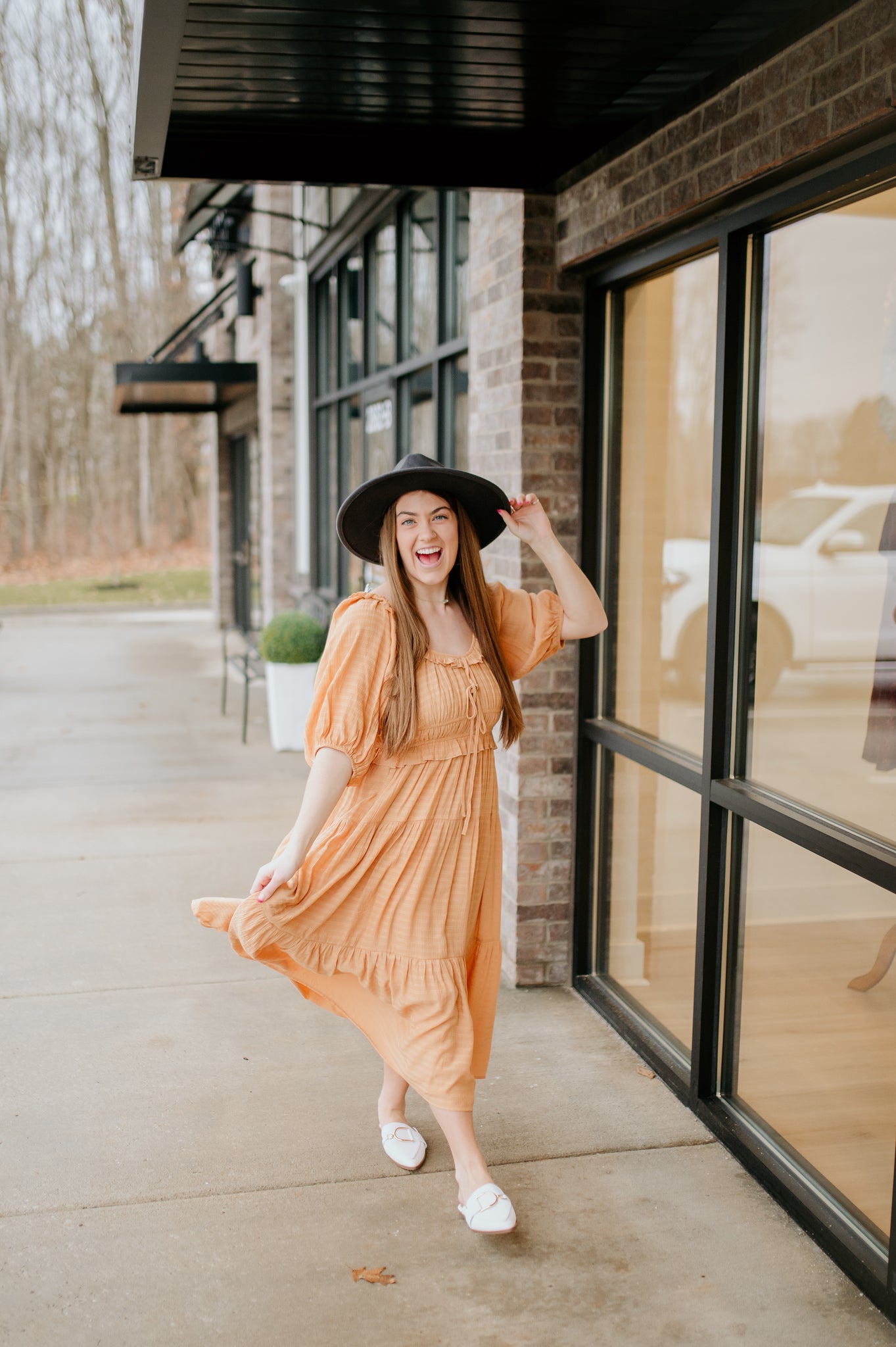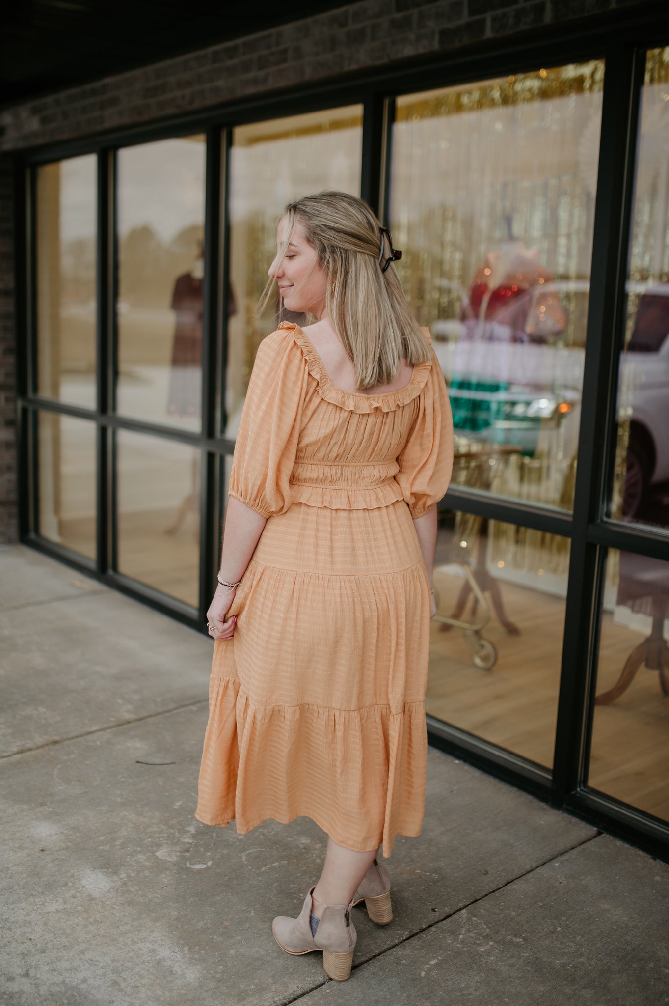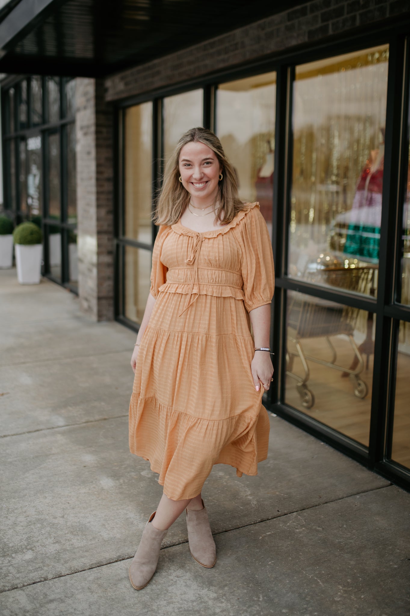 - Ruffle front tie tiered midi dress - Stripe textured fabrication - Scoop neck with ruffle and tie string - Elastic on waist - Puff sleeves - Tiered skirt - Hidden side seam pockets - Finished with clean hem - Lined