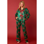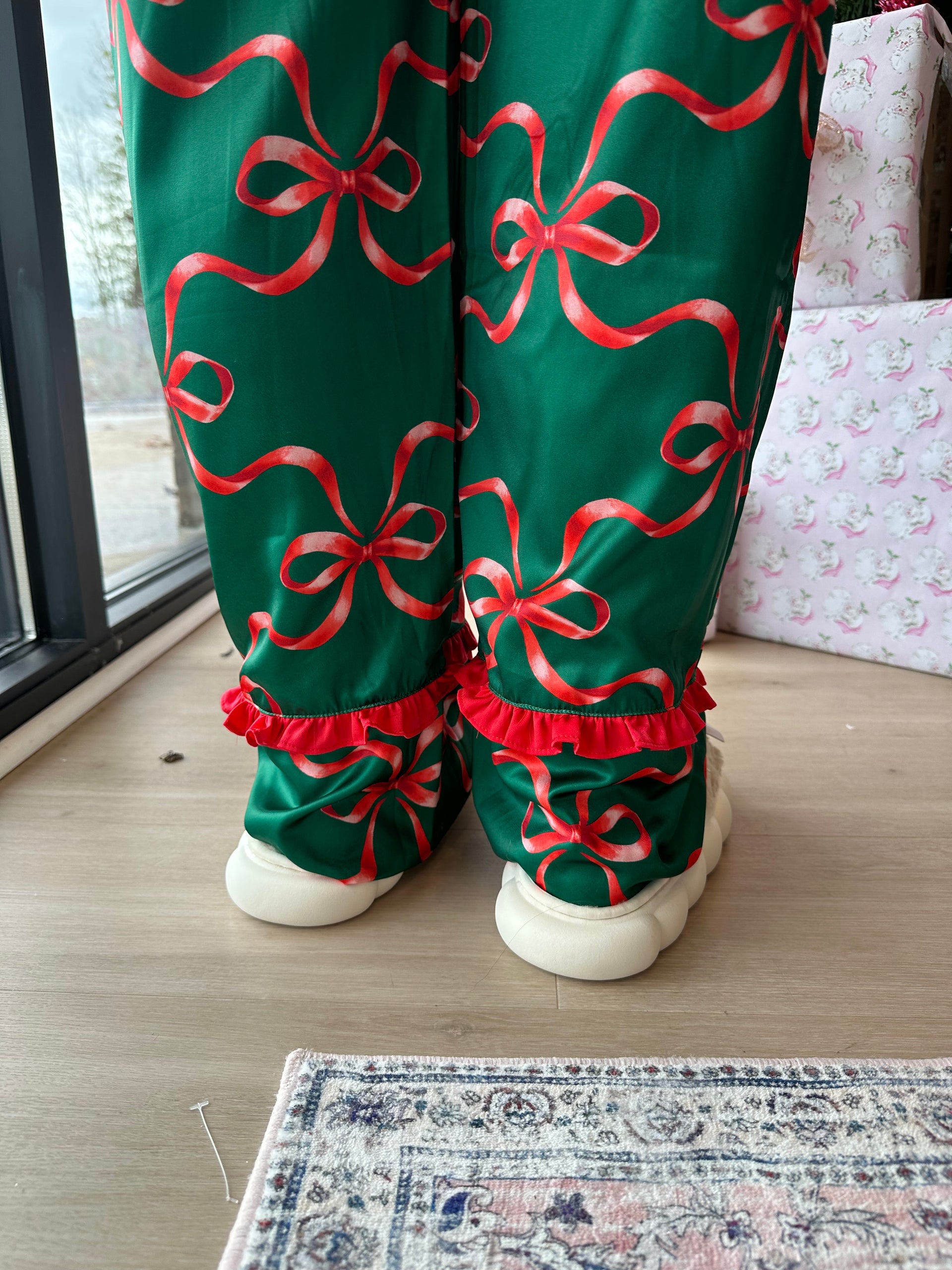 Satin Bow Prints Tie Front Ruffle Detailed Long Sleeve Pajama Set - Collared - Long sleeves - Chest pocket - Contrast ruffle detailed hem and seam - Front tie detail - Elastic waistband - Front drawstring tie Set Only.