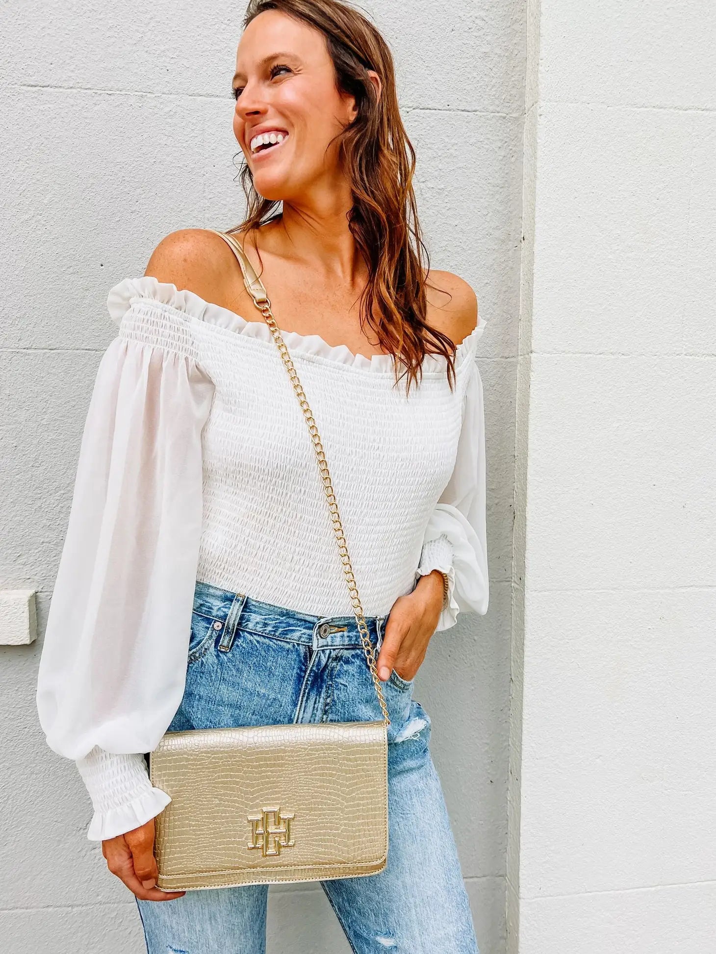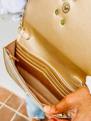 This vegan leather crossbody features the signature, shiny gold Caroline Hill logo on the front magnetic flap. It has several interior sections to keep all of your items organized. The chain strap can be doubled up making this a versatile bag to carry. Dimensions: 6.5" tall x 8.5" wide