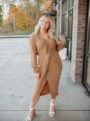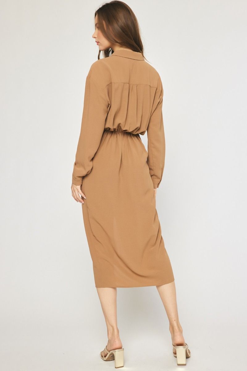 Collared v-neck long sleeve wrap-style dress featuring twist detail at front. Invisible button closure at bust. Button closure at sleeves. Elastic at back. Lined. Woven. Non-sheer. Lightweight.