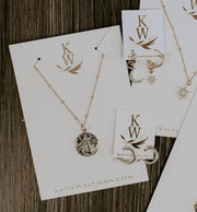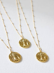 Medallion necklaces are one of our favorite looks. This vintage bee medallion pairs perfectly with our delicate satellite chain for a look that won't go out of style. Gold plate round vintage bee medallion. 14-16" adjustable. Gold filled satellite chain.