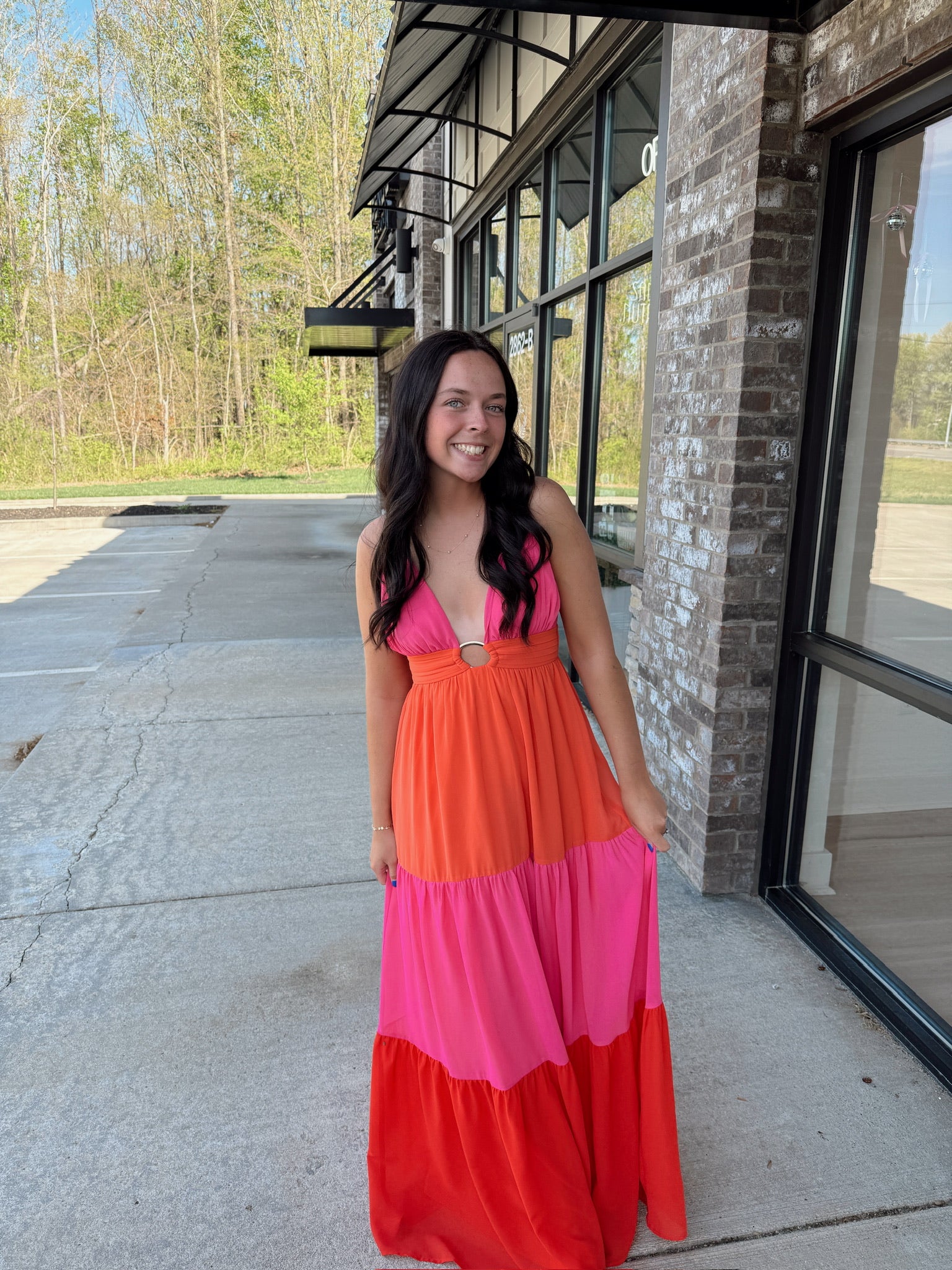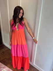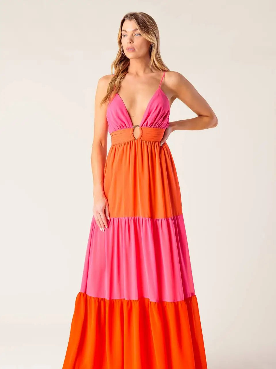 A solid woven color blocked maxi dress featuring cami top with straps, shirred waist band with center hardware, tiered skirt and smocked back waistband Details: Self : 100% Polyester Contrast 1 & 2 : 100% Polyester Lining 1 & 2 : 100% Polyester