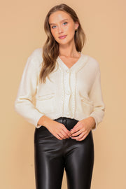 This knitted cardigan features a V-neckline and button-down front. The sweater is adorned with braided details along the front edges and pocket outlines, adding a touch of texture and visual interest. The cardigan has long sleeves and a slightly cropped fit, making it a versatile piece that can be paired with various bottoms for a cozy yet stylish look. The material appears soft and comfortable, suitable for layering in cooler weather.