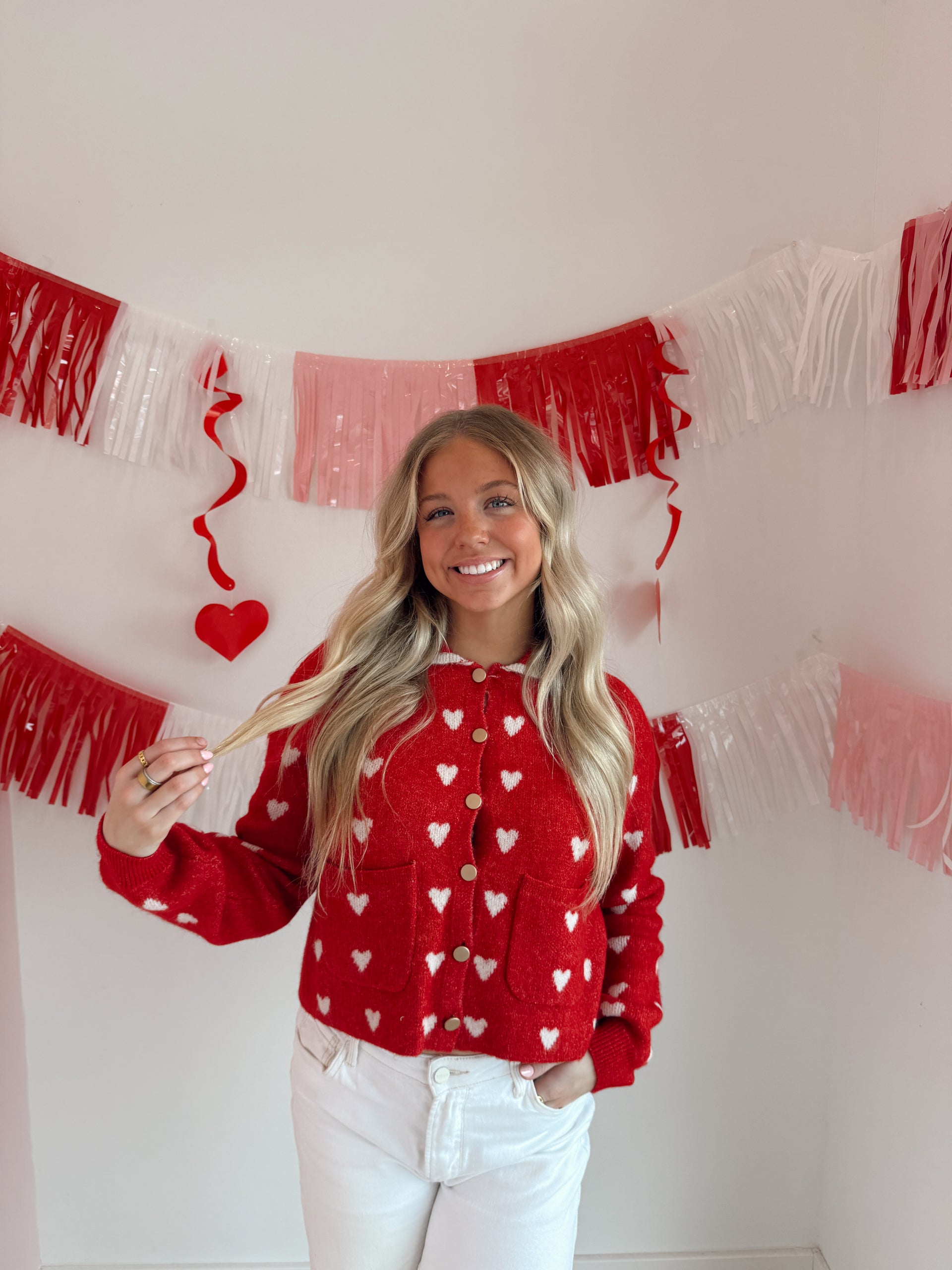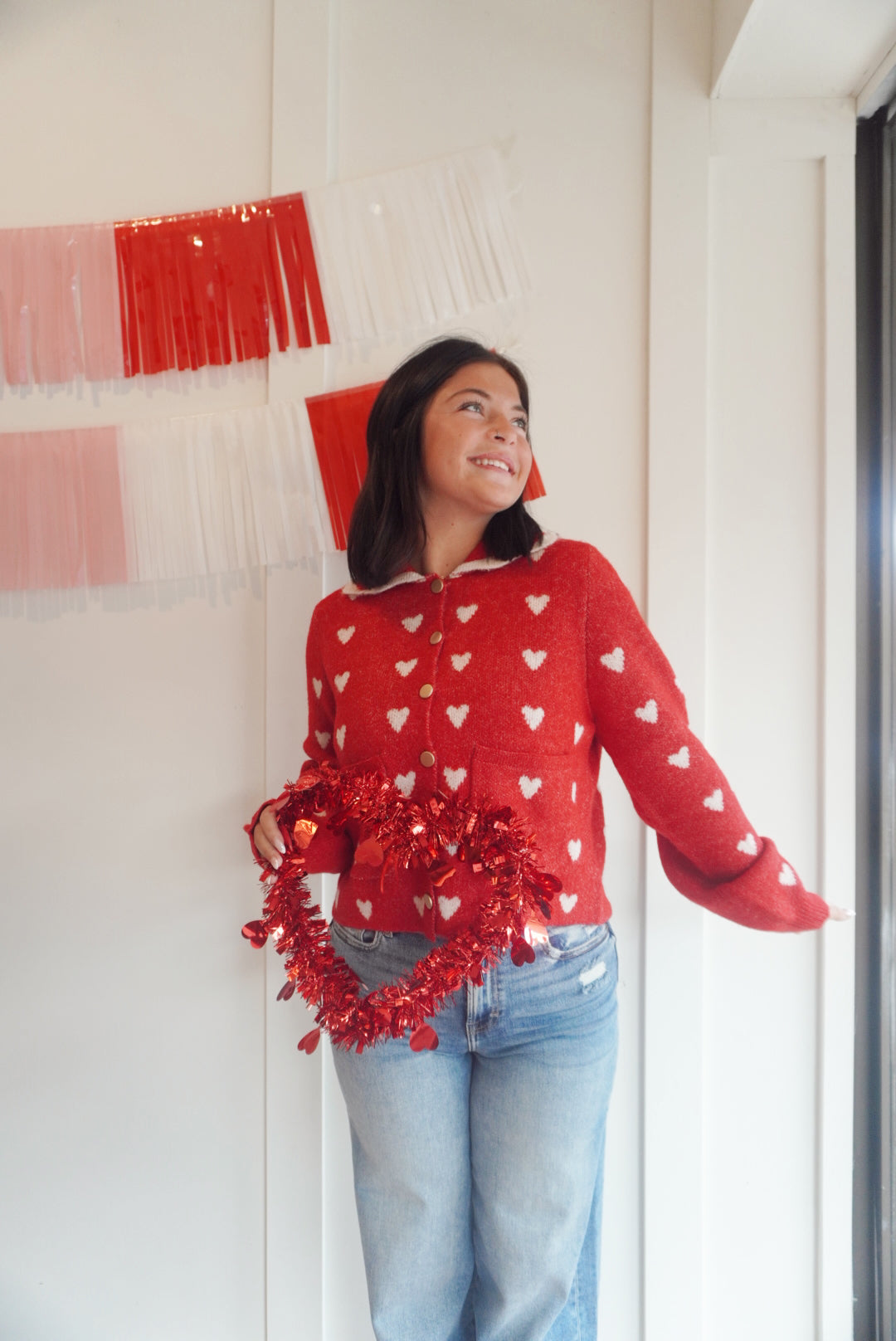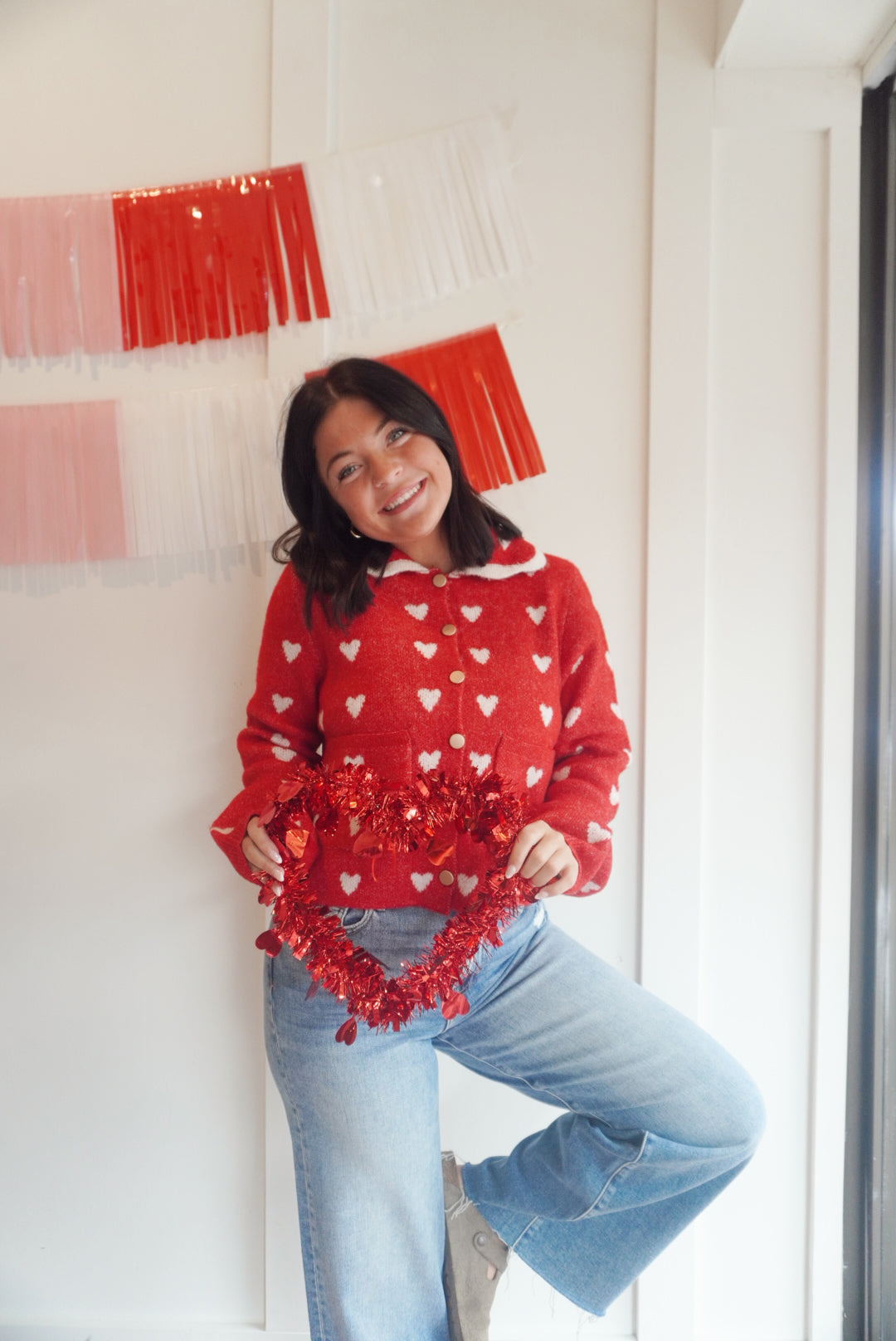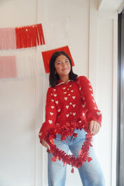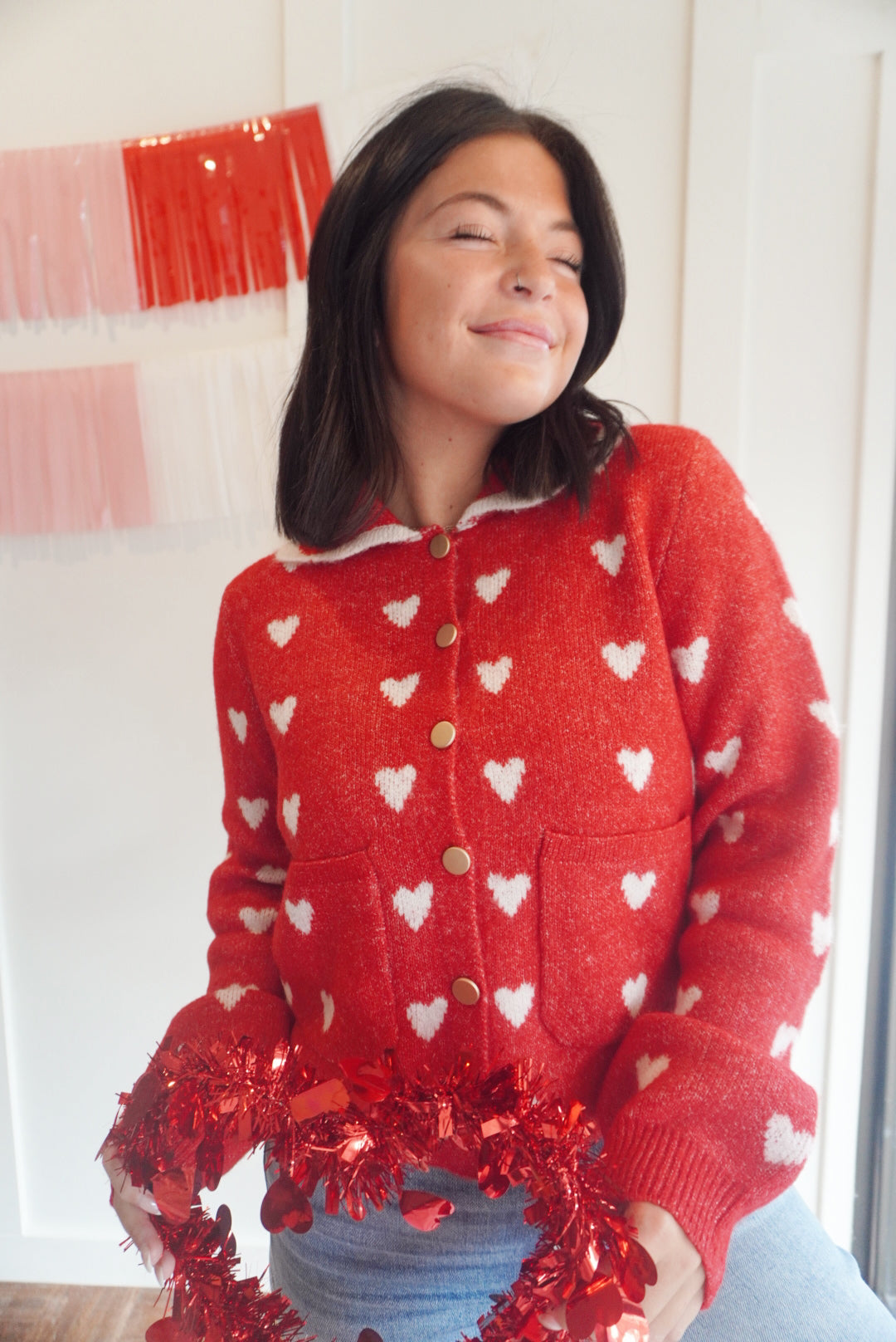 Heart pattern scallop collar button down cardigan