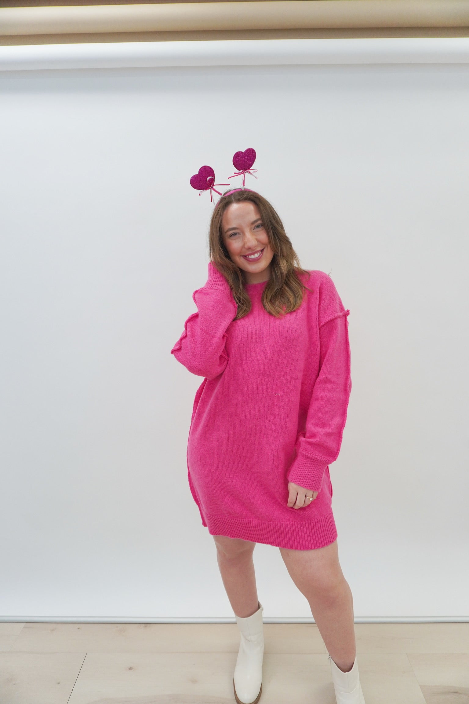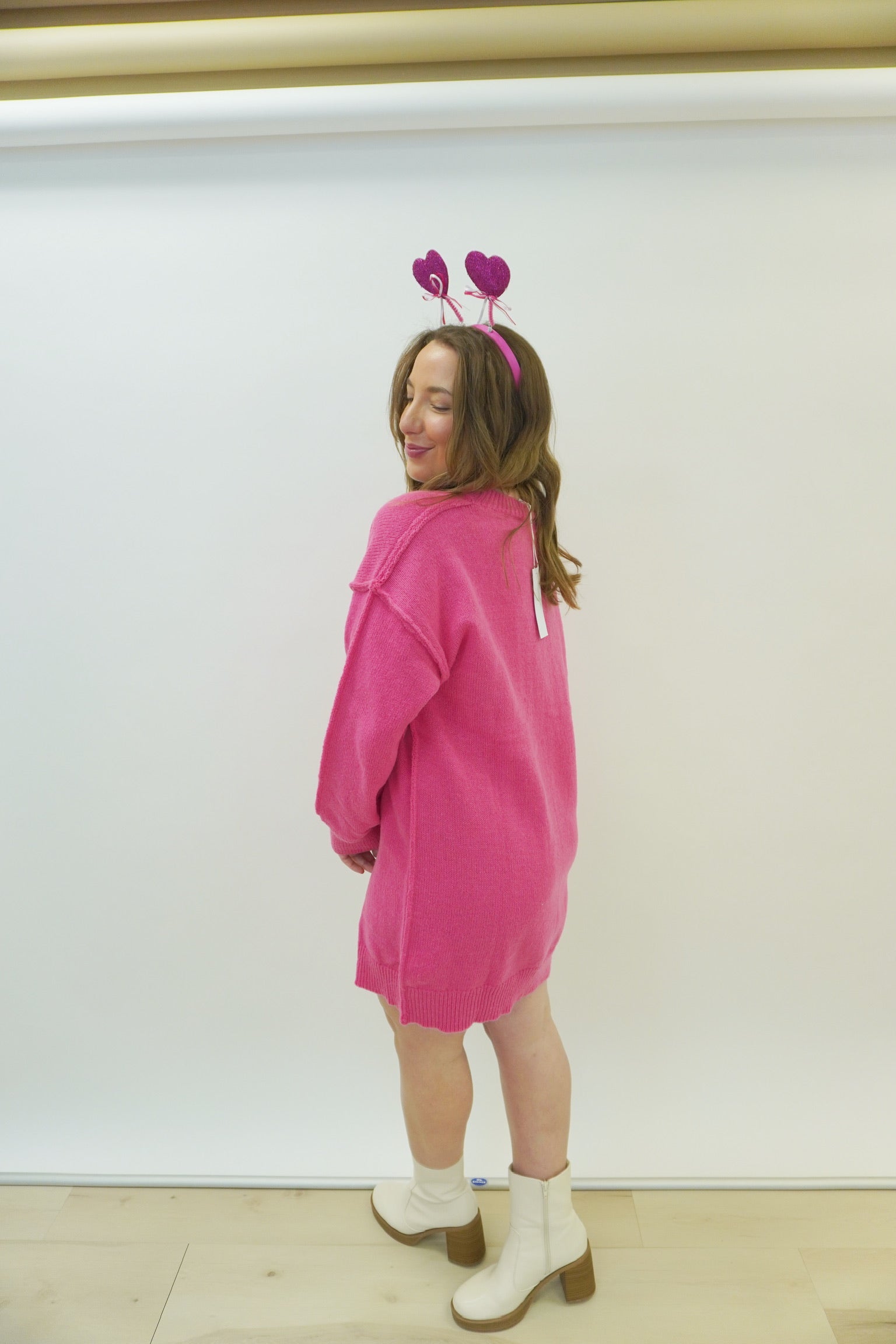 Add some playful pop to your wardrobe with our Oversize Tunic Sweater Dress in hot pink! The perfect blend of comfort and style, this dress is oversized for a relaxed fit and is sure to turn heads. Pair it with your favorite booties for a fun and fashionable look. (Fashion-forward and cozy!)
