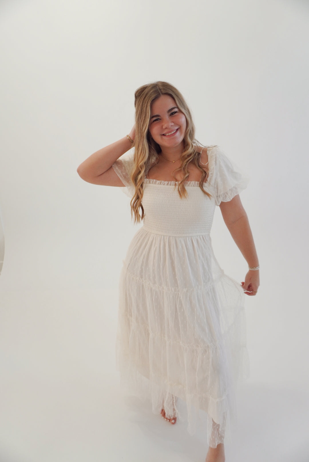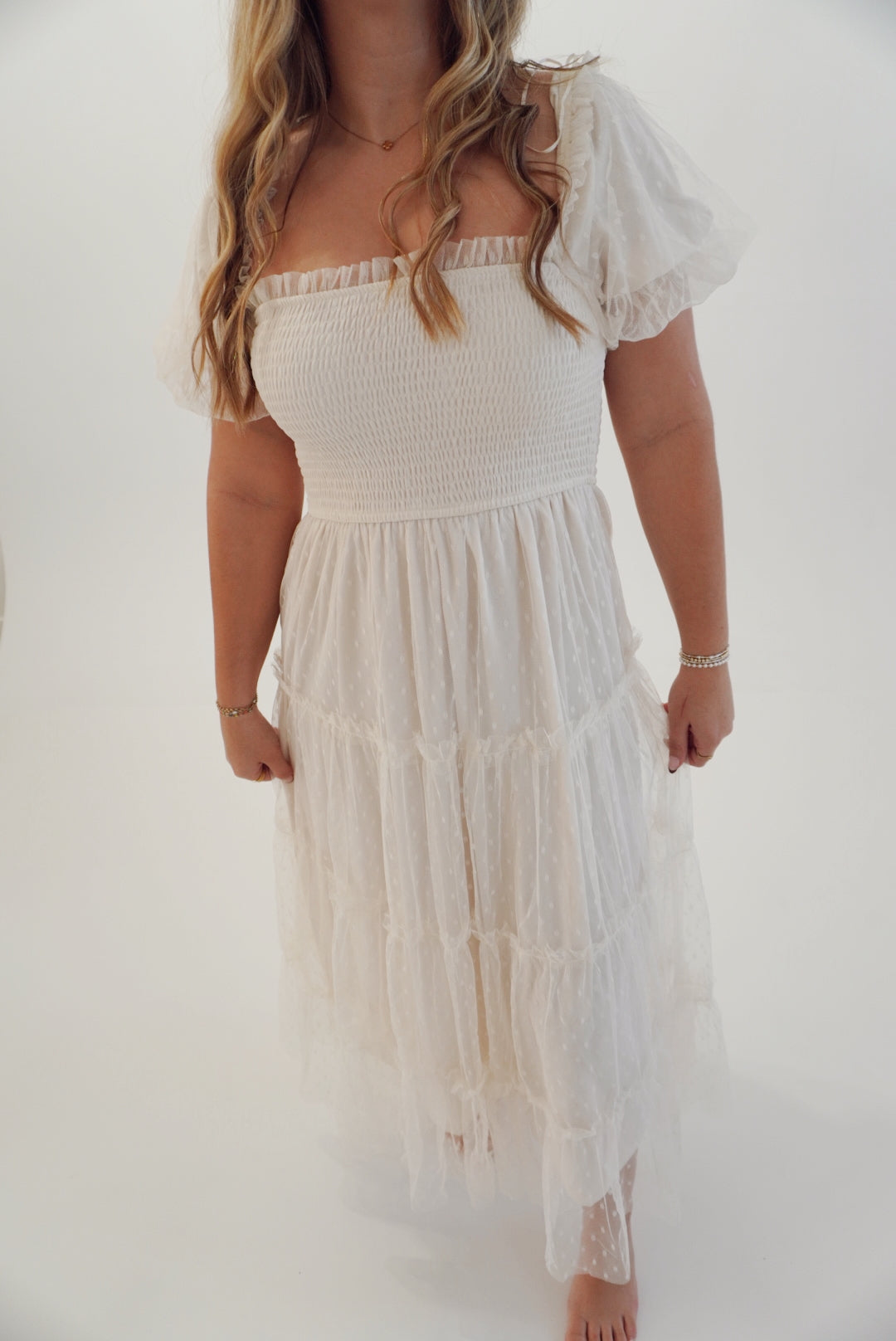 Polka dot tulle puff sleeve smocked tiered midi dress