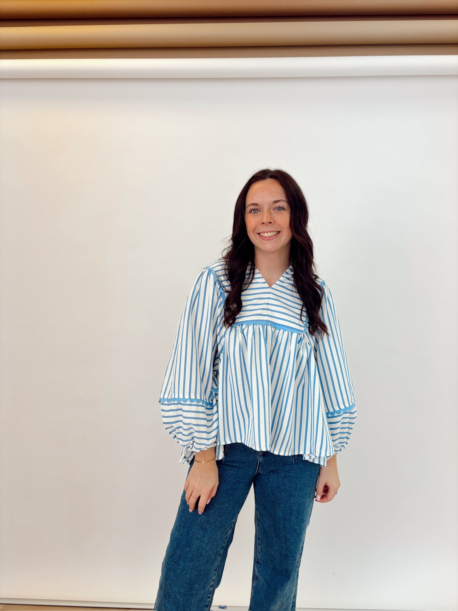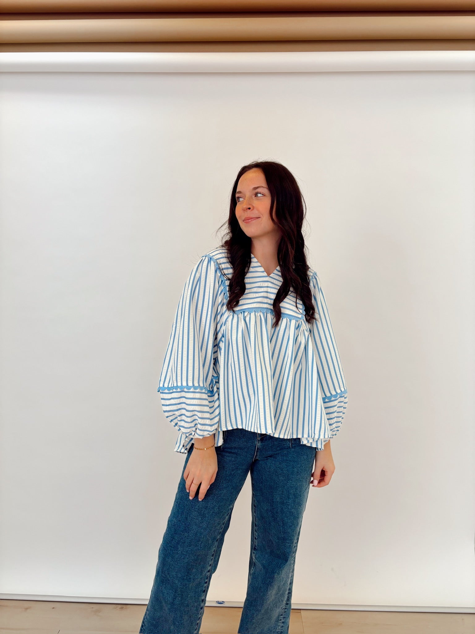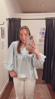 Striped collared v-neck pullover ¾ lantern sleeve top accented with scallop trim detail at yoke and sleeve. Unlined. Woven. Non-sheer. Lightweight.