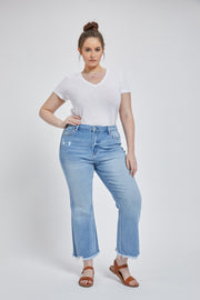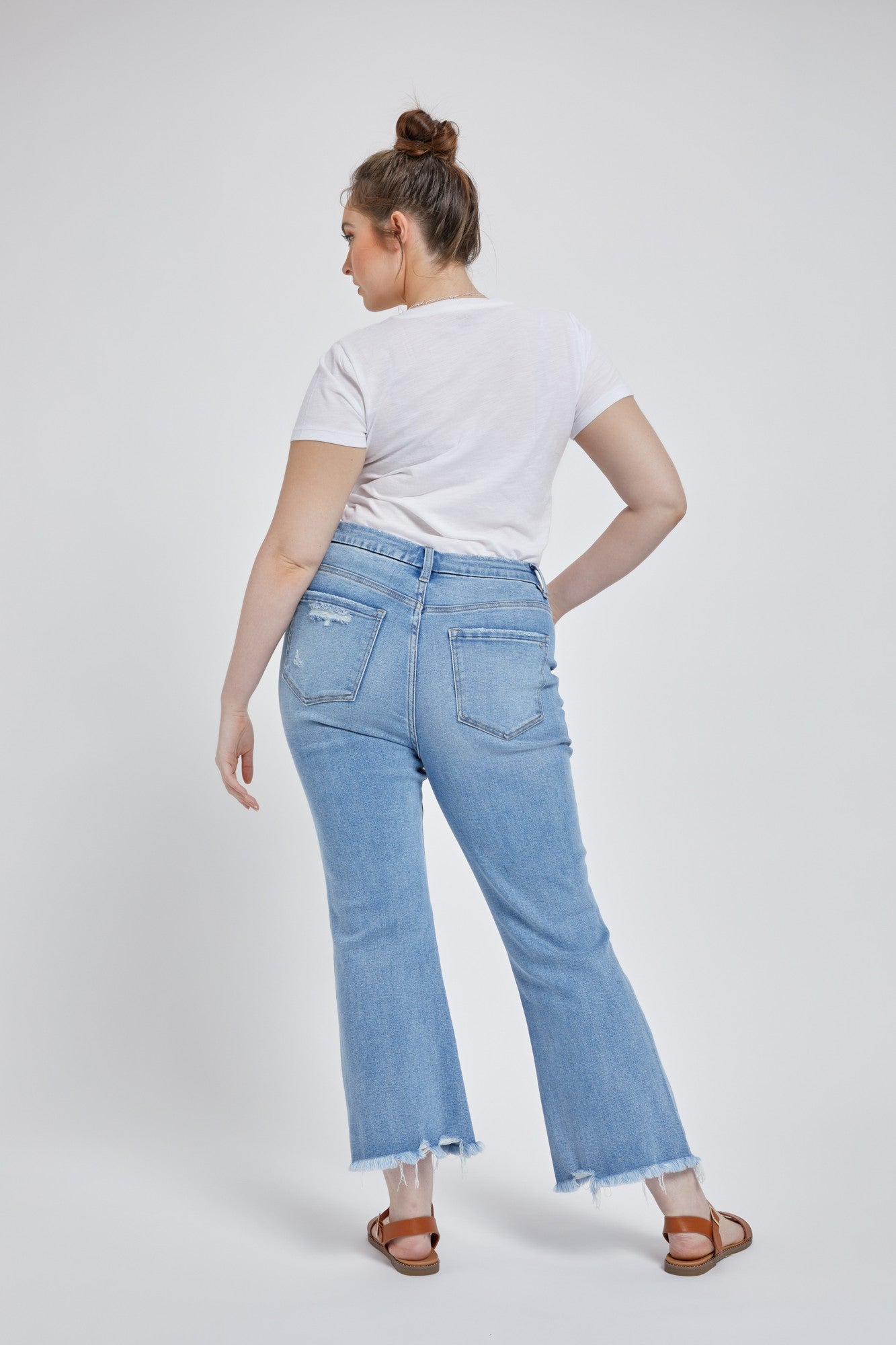 HIGH RISE CROP FLARE 92.5% COTTON, 5.5% POLYESTER, 2% SPANDEX FRONT RISE: 12 1/2" INSEAM: 27" LEG OPENING: 22"