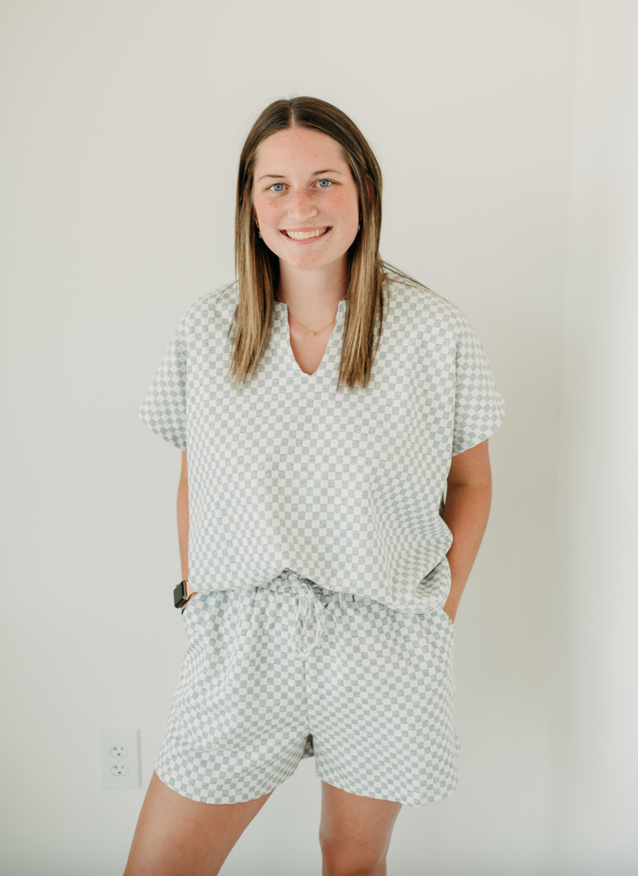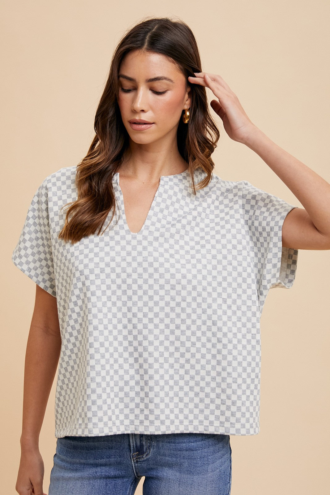 - CHECKERBOARD KNIT FABRIC - NOTCHED NECK - SHORT DOLMAN SLEEVE - LOOSE FIT