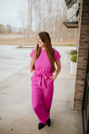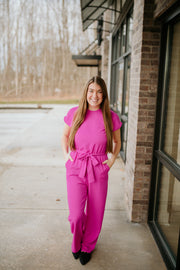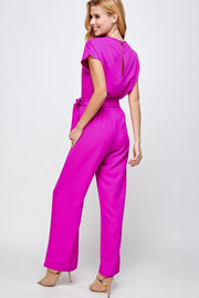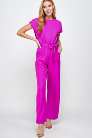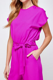Solid jumpsuit Detachable and adjustable waist tie Elastic in waistband for comfortable fit Back button keyhole closure Cap sleeve Full length Solid woven crepe fabric