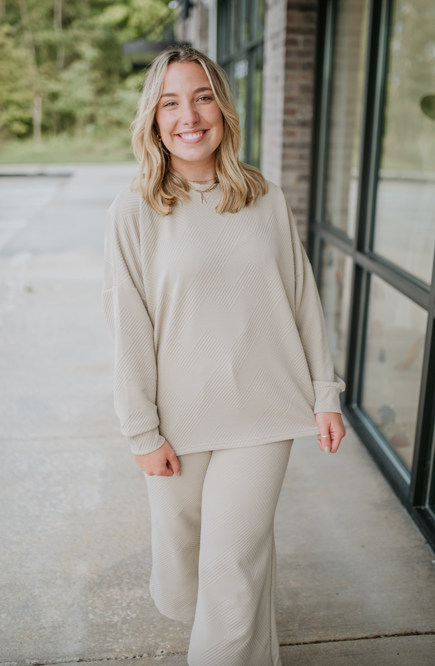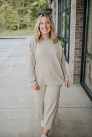 Solid textured matching top and pants. The top featured mock neck, dropped shoulder, cuffed sleeves and slit hem. The pants features elastic waist, drawstring, pockets, wide legs and ankle length.
