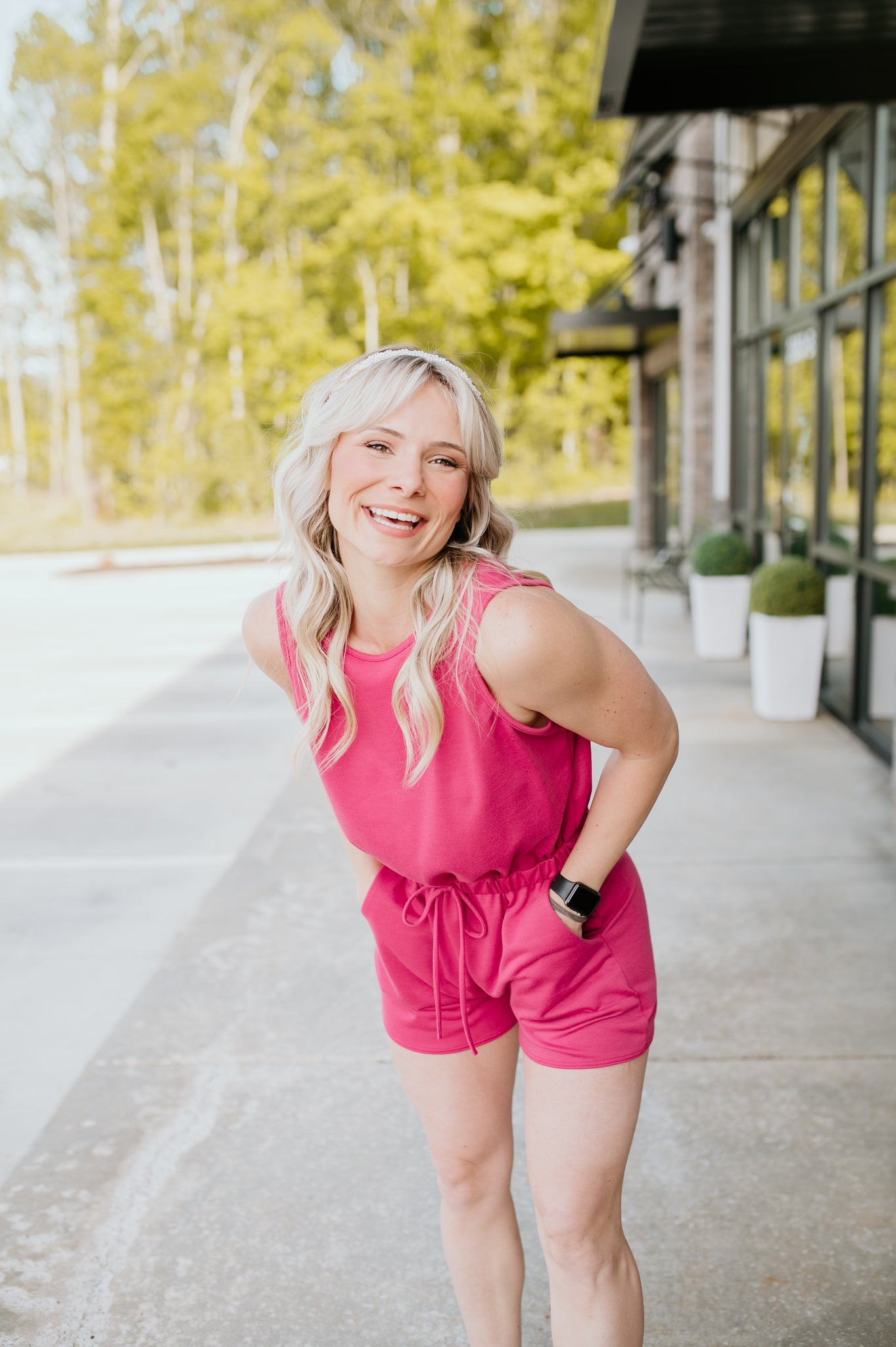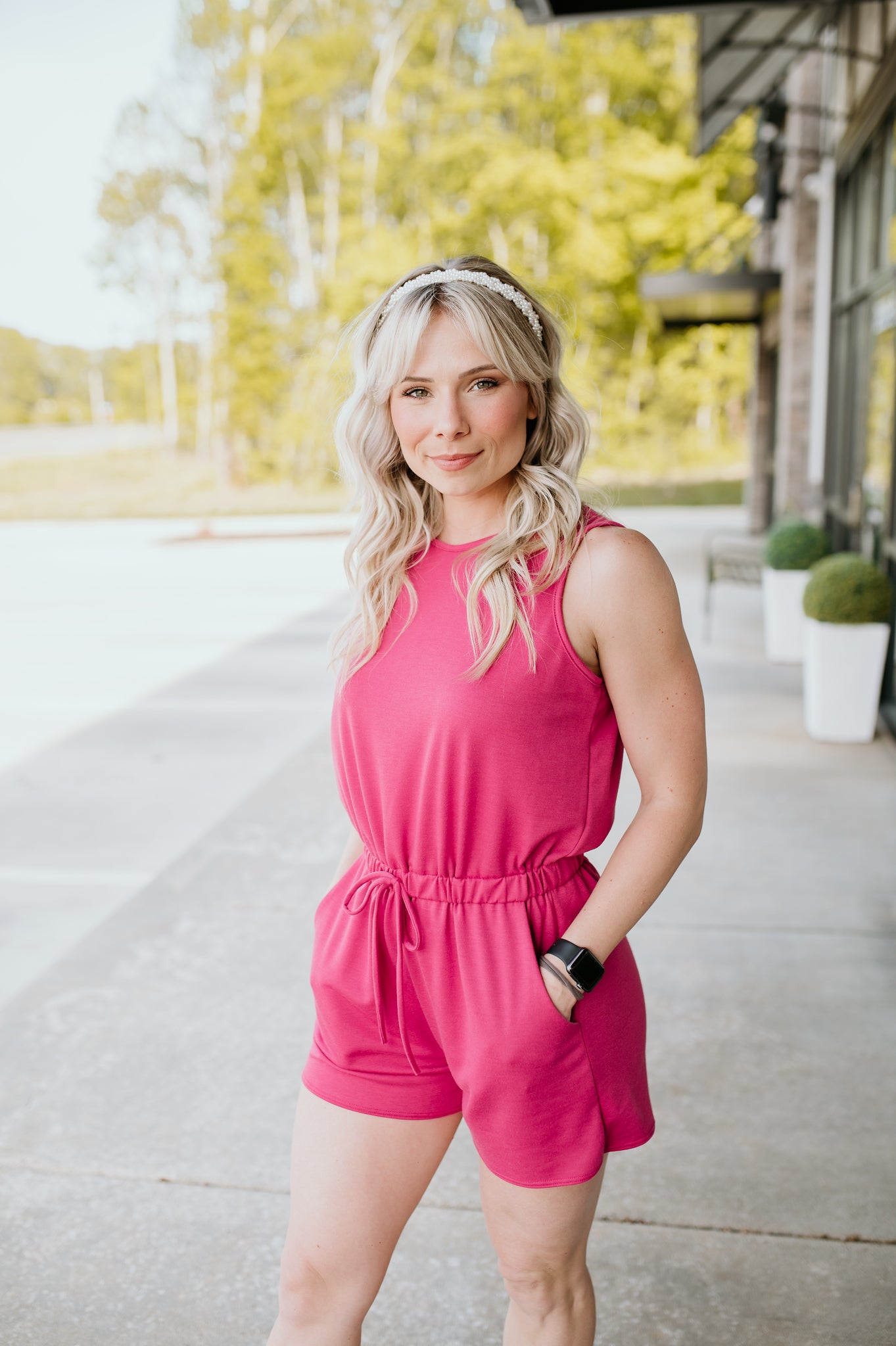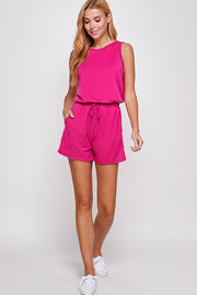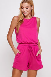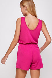 Solid super soft french terry romper Scoop back Sleeveless Hip pockets Elastic in waistband w/ spaghetti detail Knit french terry fabric Daria is 5'9.5" Bust 33 - Waist 25 - Hips 34 Here she's wearing a size S Size S HPS Length is 34" inseam is 3"