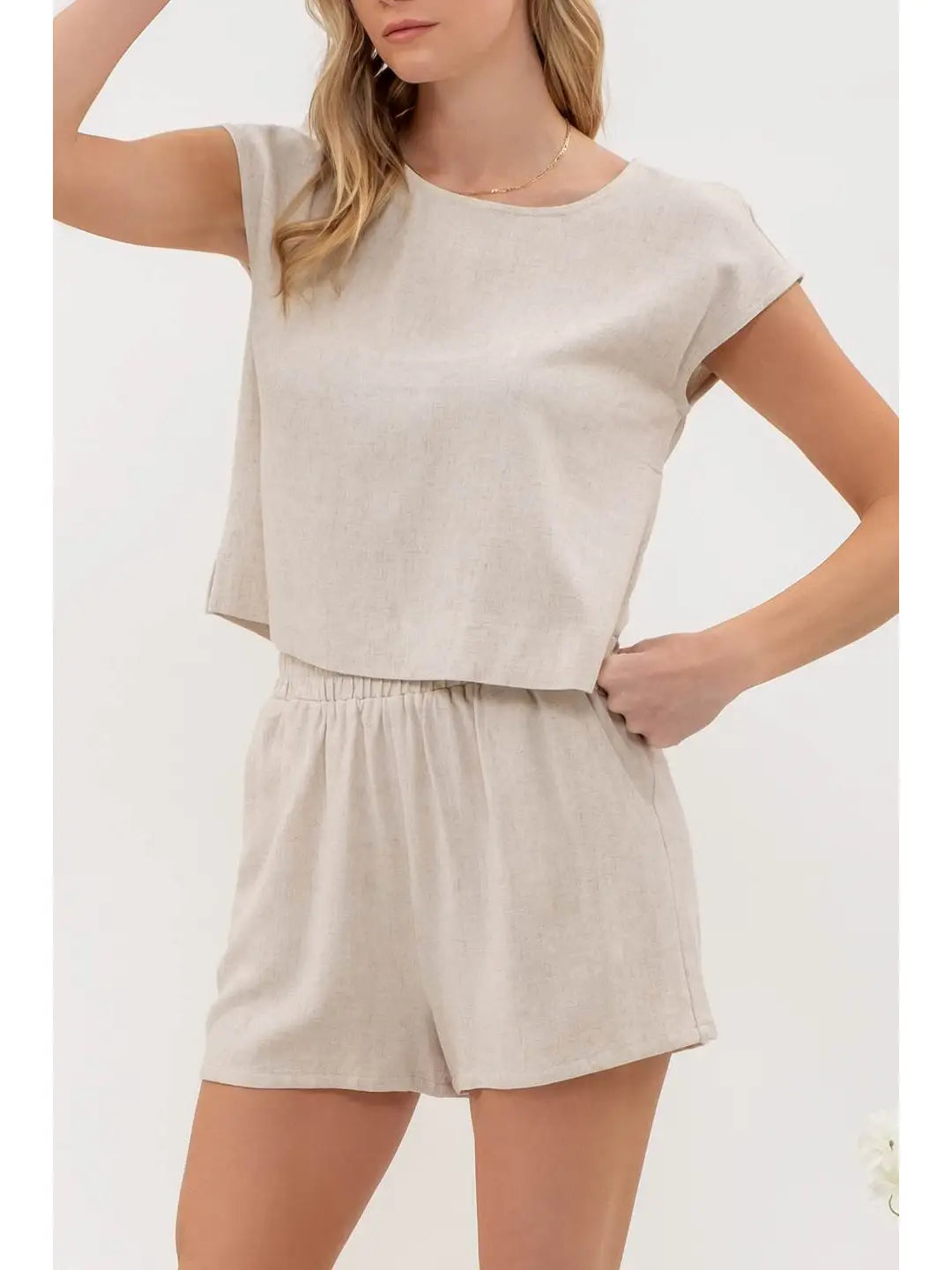 ROUND NECKLINE SHORT SLEEVES EXTENDED SHOULDER BOXY WOVEN TOP SELF: RAYON 80% , LINEN 20%