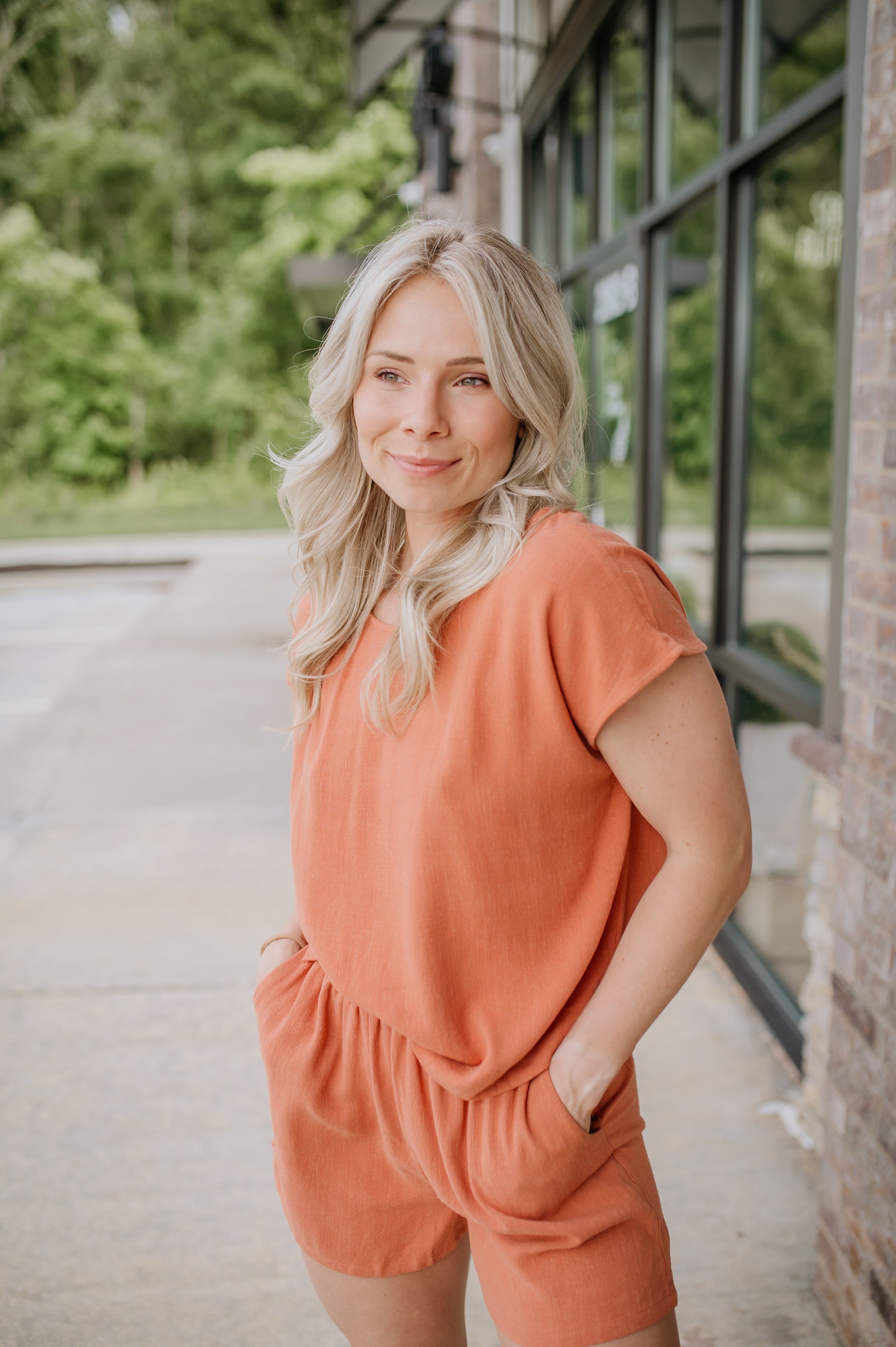 ROUND NECKLINE SHORT SLEEVES EXTENDED SHOULDER BOXY WOVEN TOP SELF: RAYON 80% , LINEN 20%