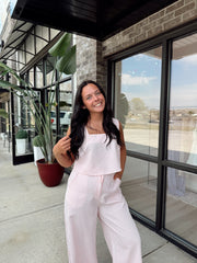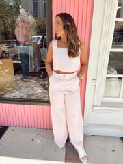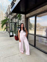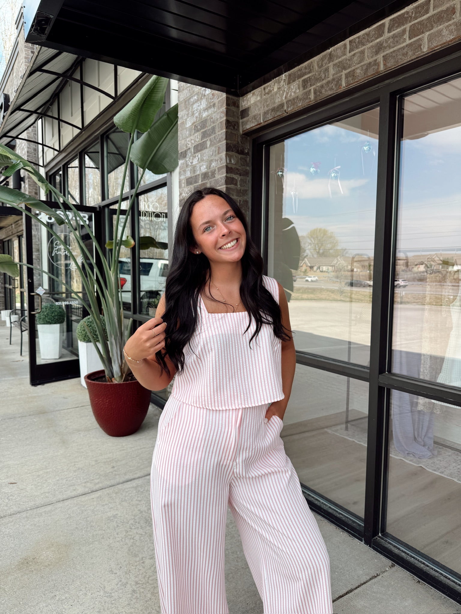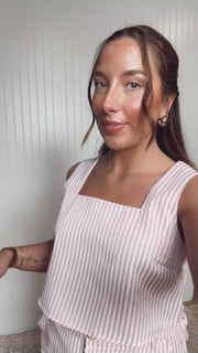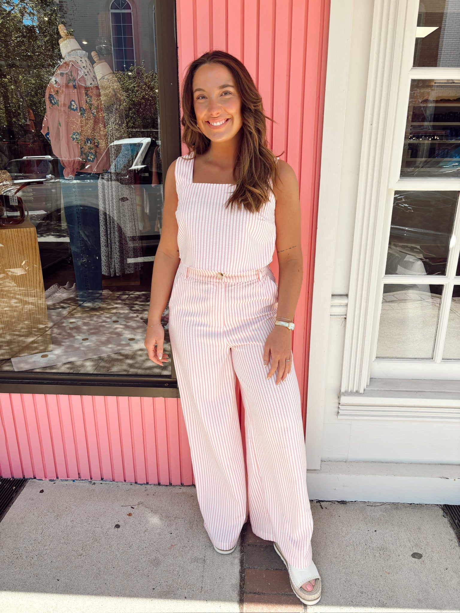 Featuring A Trendy Striped Print All Over, The Top Shapes A Square Neckline With Thick Shoulder Straps, Sleeveless Cut Bodice And A Relaxed Fit. The Matching Pants Offer A High Rise Silhouette That Falls Into Flowy, Wide Pant Legs.