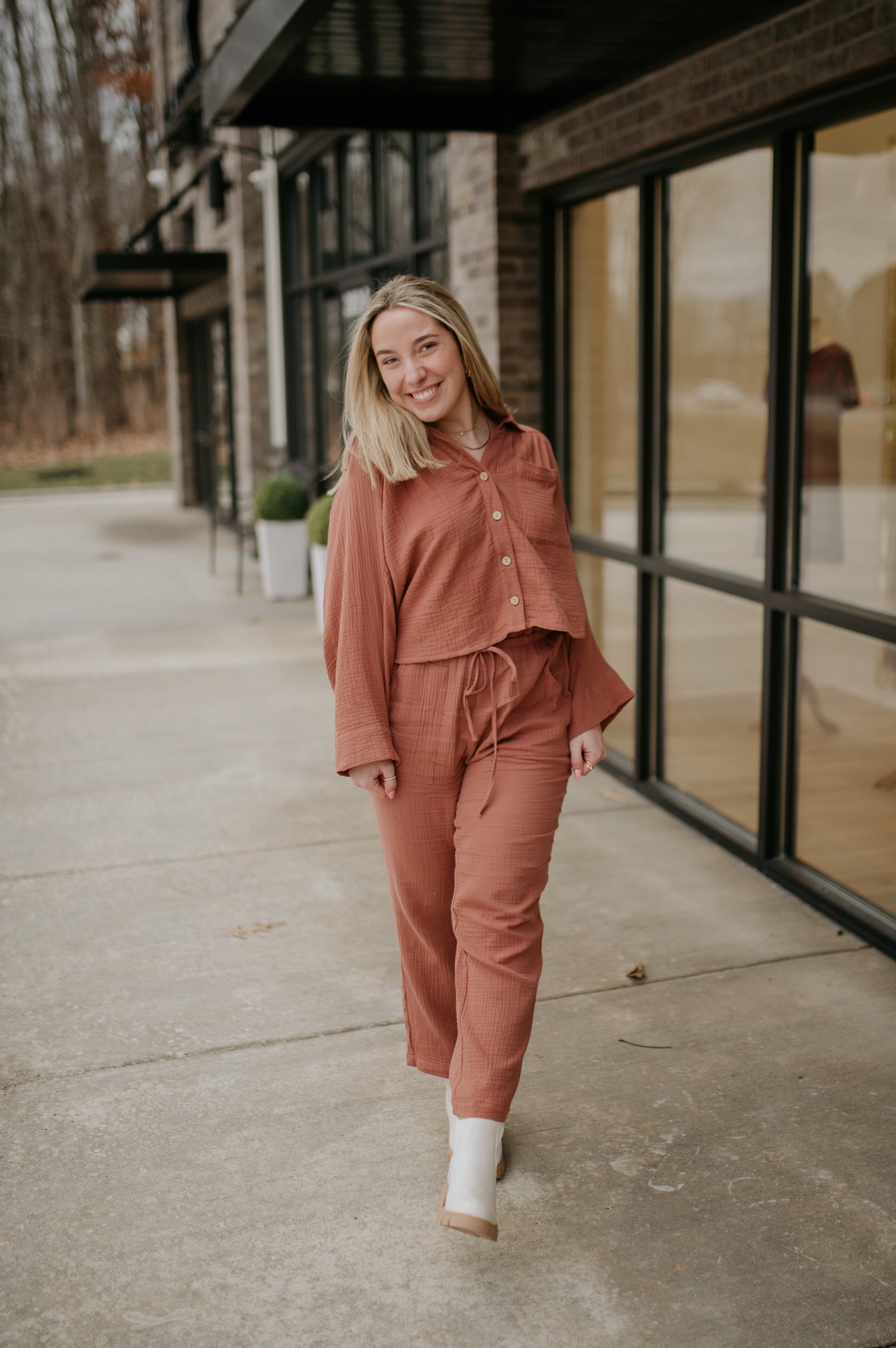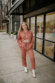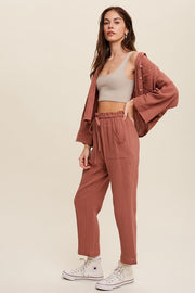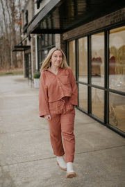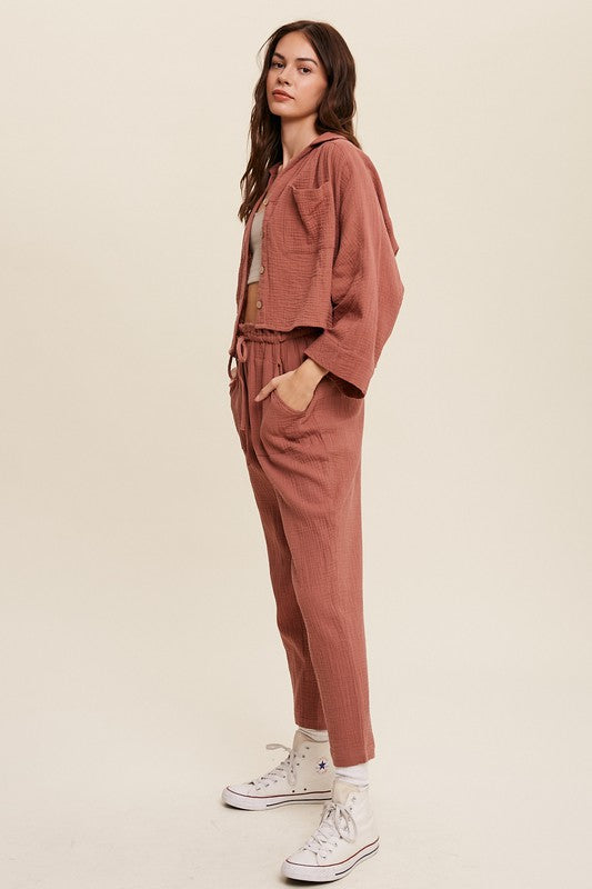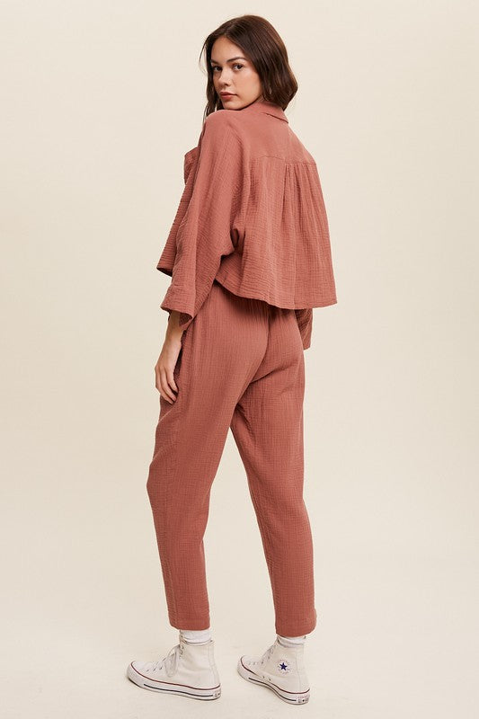 - Long sleeve button down and long pants sets TOP: - Textured cotton fabrication - Button down top with patch pocket on chest - Long sleeve - Finished with clean curved hem PANTS - Drawstring waist - Pockets - Lined