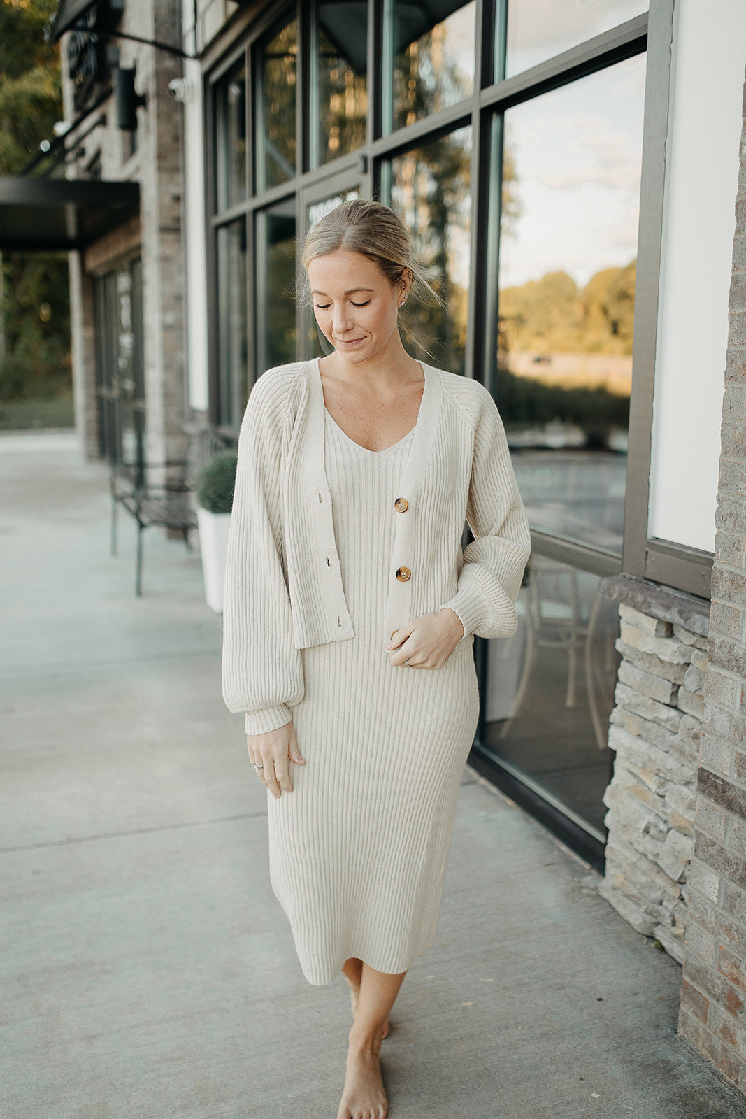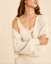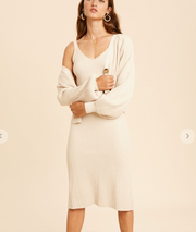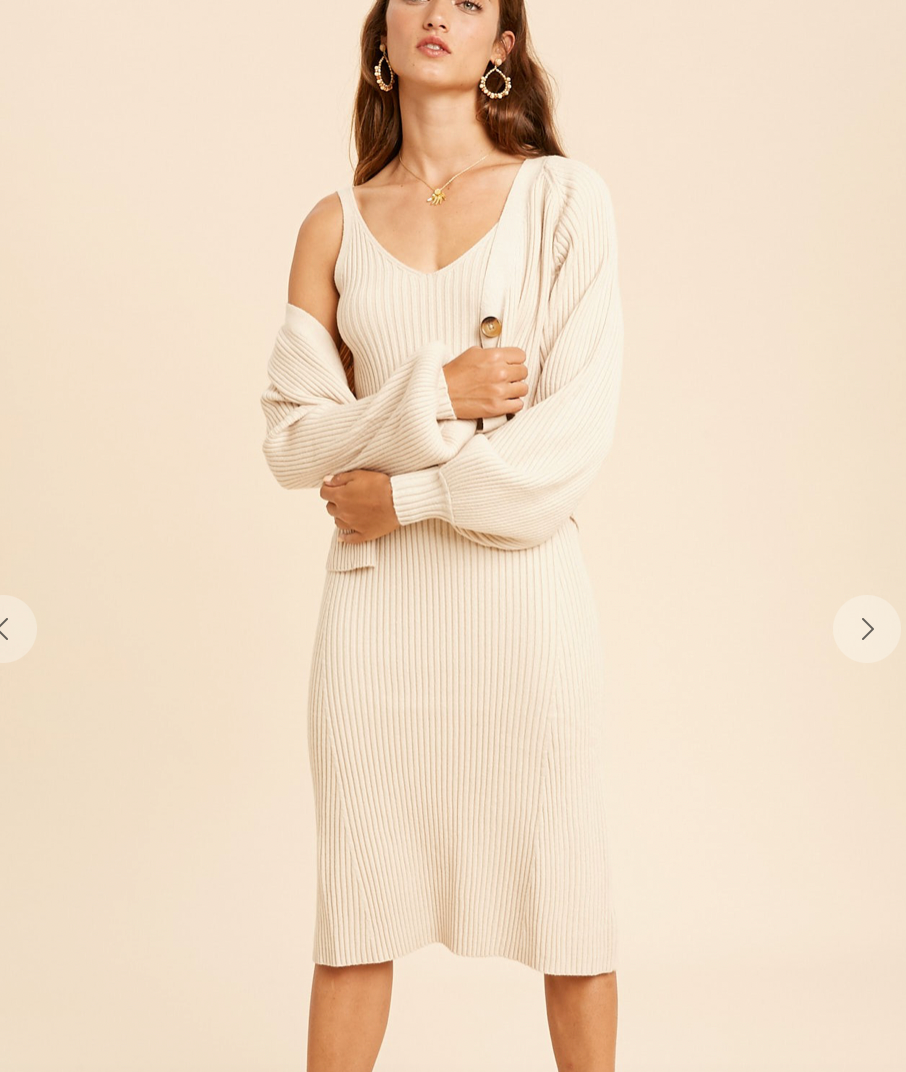 VISCOSE THREAD! HIGH QUALITY KNITTED CARDIGAN AND DRESS- SOLD AS A SET! DRESS: RIBBED KNITTED KNEE LENGTH TANK DRESS WITH A LOW BACK. CARDIGAN FEATURES STATEMENT BALLOON SLEEVES AND TORTOISE COLORED BUTTONS. DRESS HAS GOOD STRETCH. CONTENTS: SELF: 53% VISCOSE 19% NYLON 28% PBT