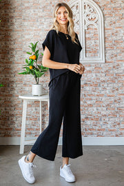 SOLID COLOR TEXTURED DROP SHOULDER ROUND NECK TOP