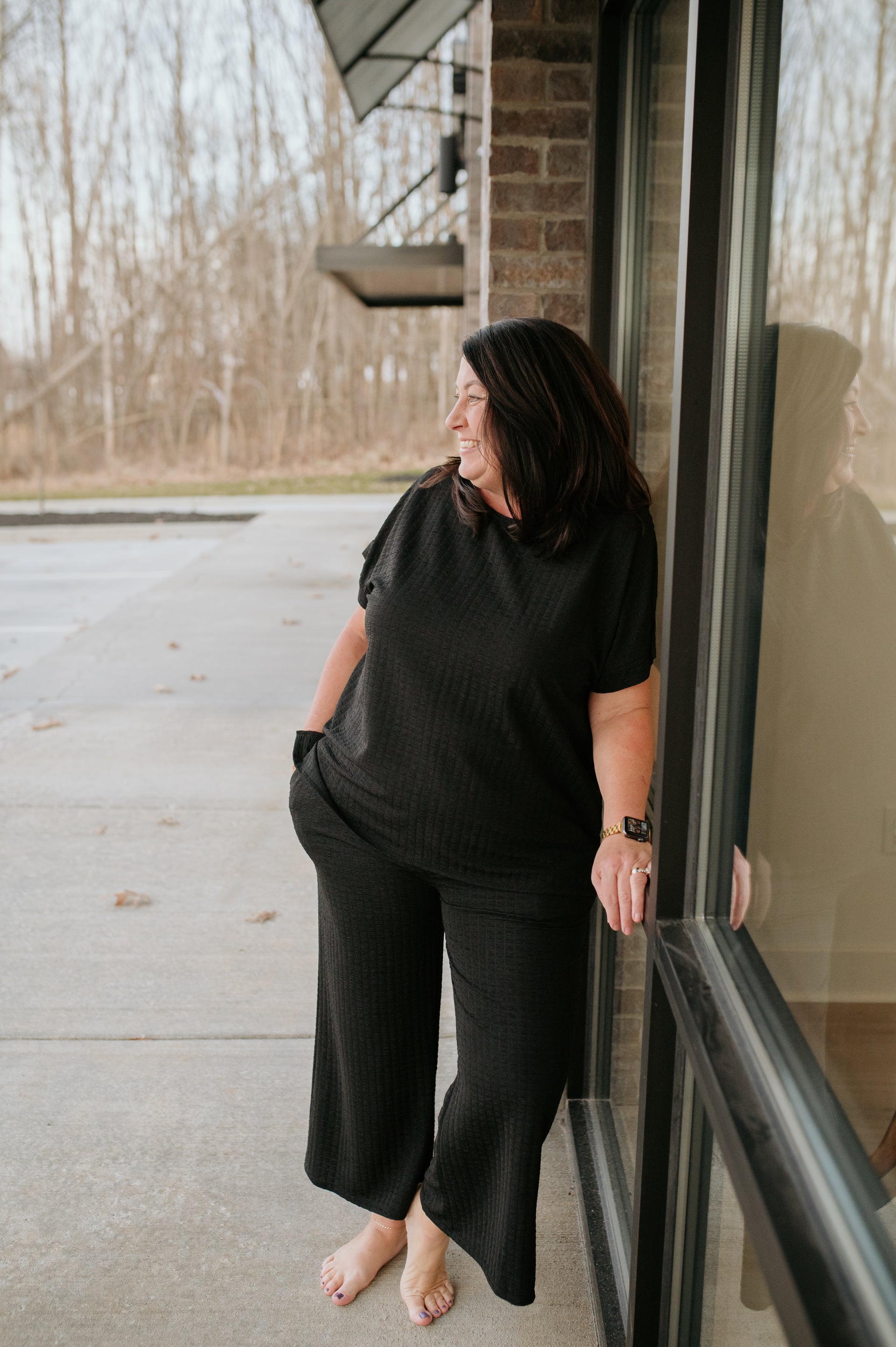 SOLID COLOR RELAXED FIT TEXTURED TOP FEATURING ROUND NECKLINE, BANDED CUFF DROPPED SHOULDER, AND SIDE SLITS.