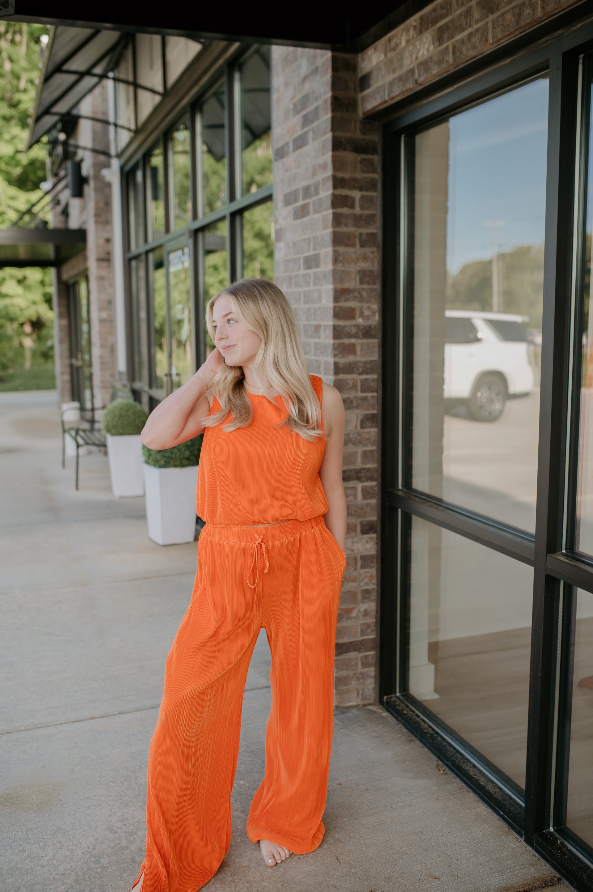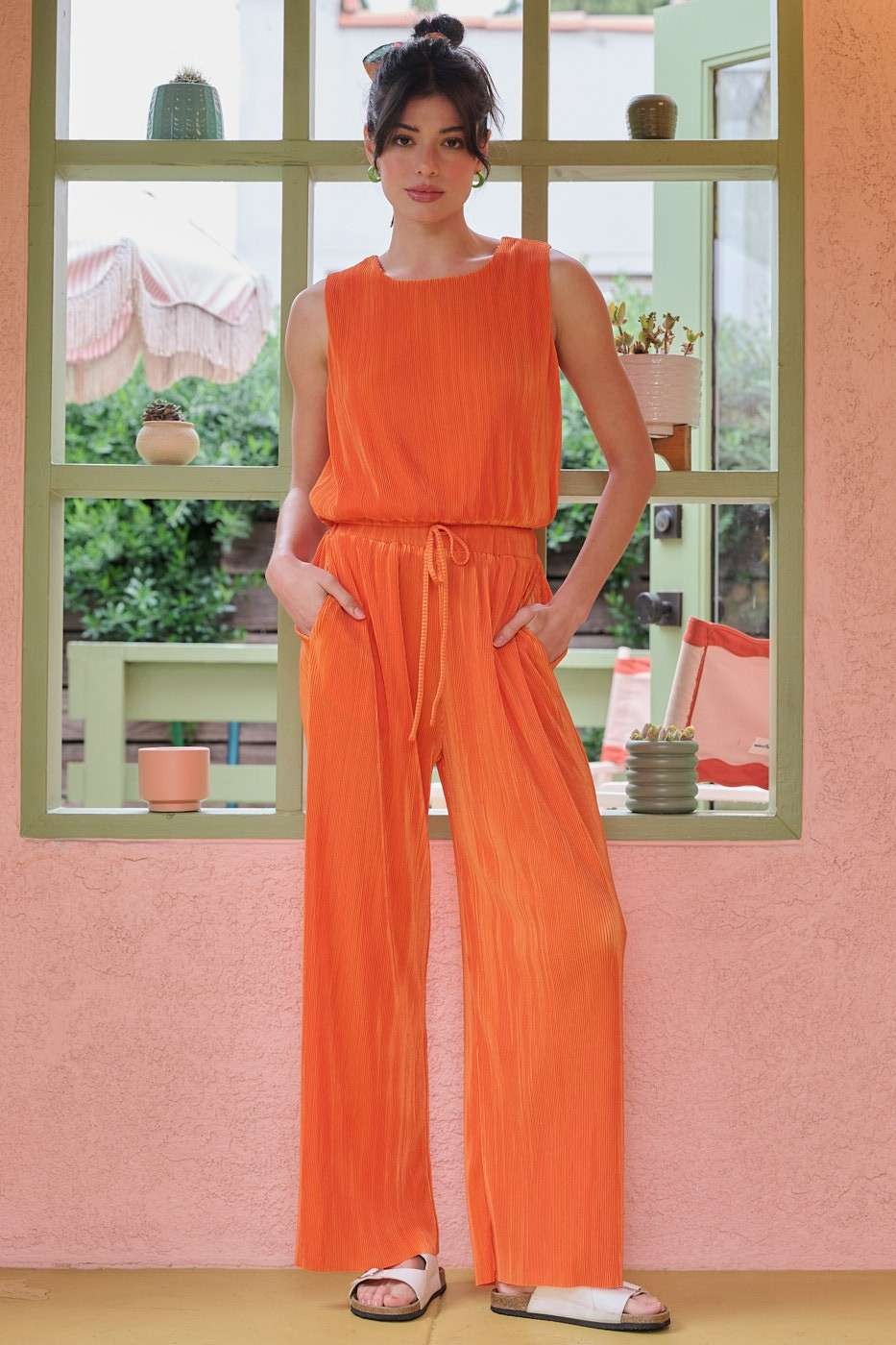 -TOP AND PANTS SET -PLEATED SATIN FABRIC TOP: - ROUND NECK - BACK BUTTON WITH KEYHOLE - SLEEVELESS - CROP LENGTH PANTS: - HIGH RISE - ELASTIC WAISTBAND WITH DRAWSTRING - SIDE SLIT ON HEM - WIDE LEG