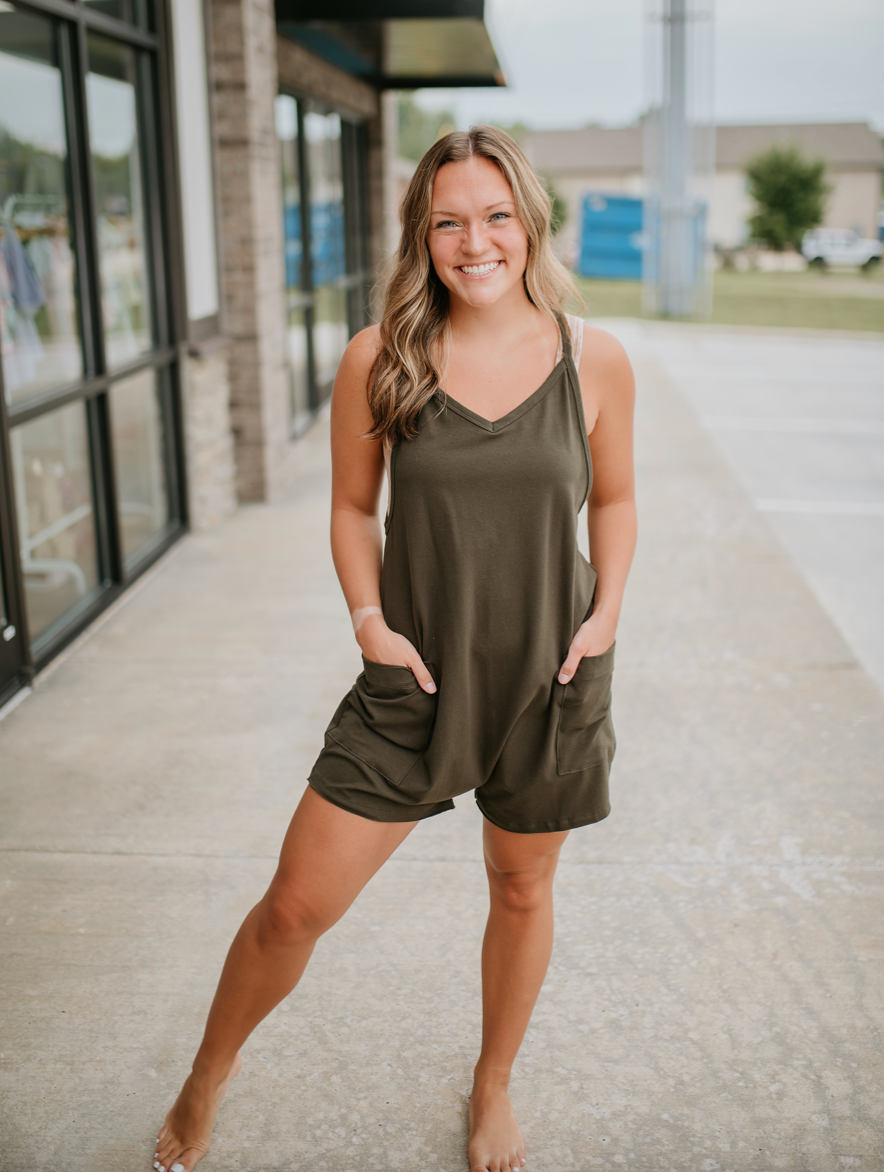 Oversize Tank V-neck Solid Jersey Romper - Effortless and oversized silhouette - Racerback - Oversized patch pockets - Dropped armholes - Soft and comfy onesie features a slouchy