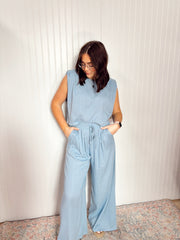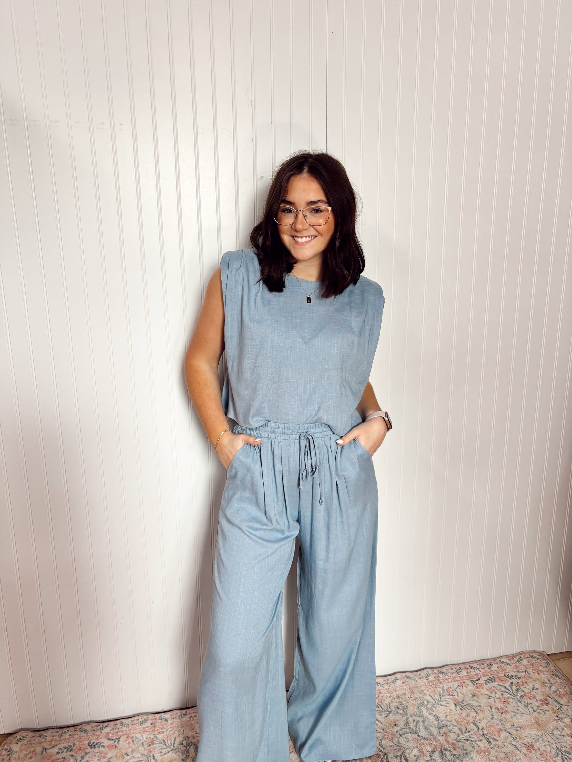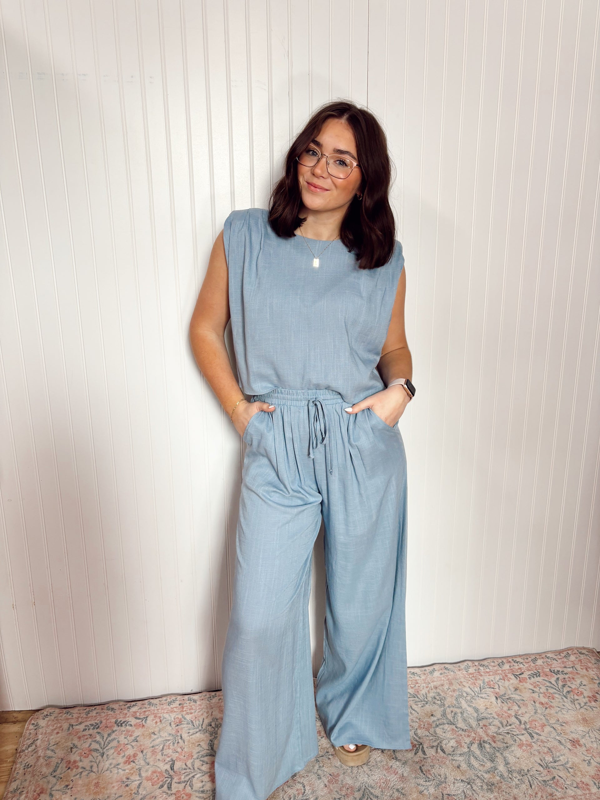Solid Woven Top & Pants Set TOP - Pleated Power Shoulder Sleeveless Top - Round Neck - Back Keyhole BOTTOM - Extreme Wide Pants - Elastic Waist W/ Drawstring - Side Pockets - Pleated Front