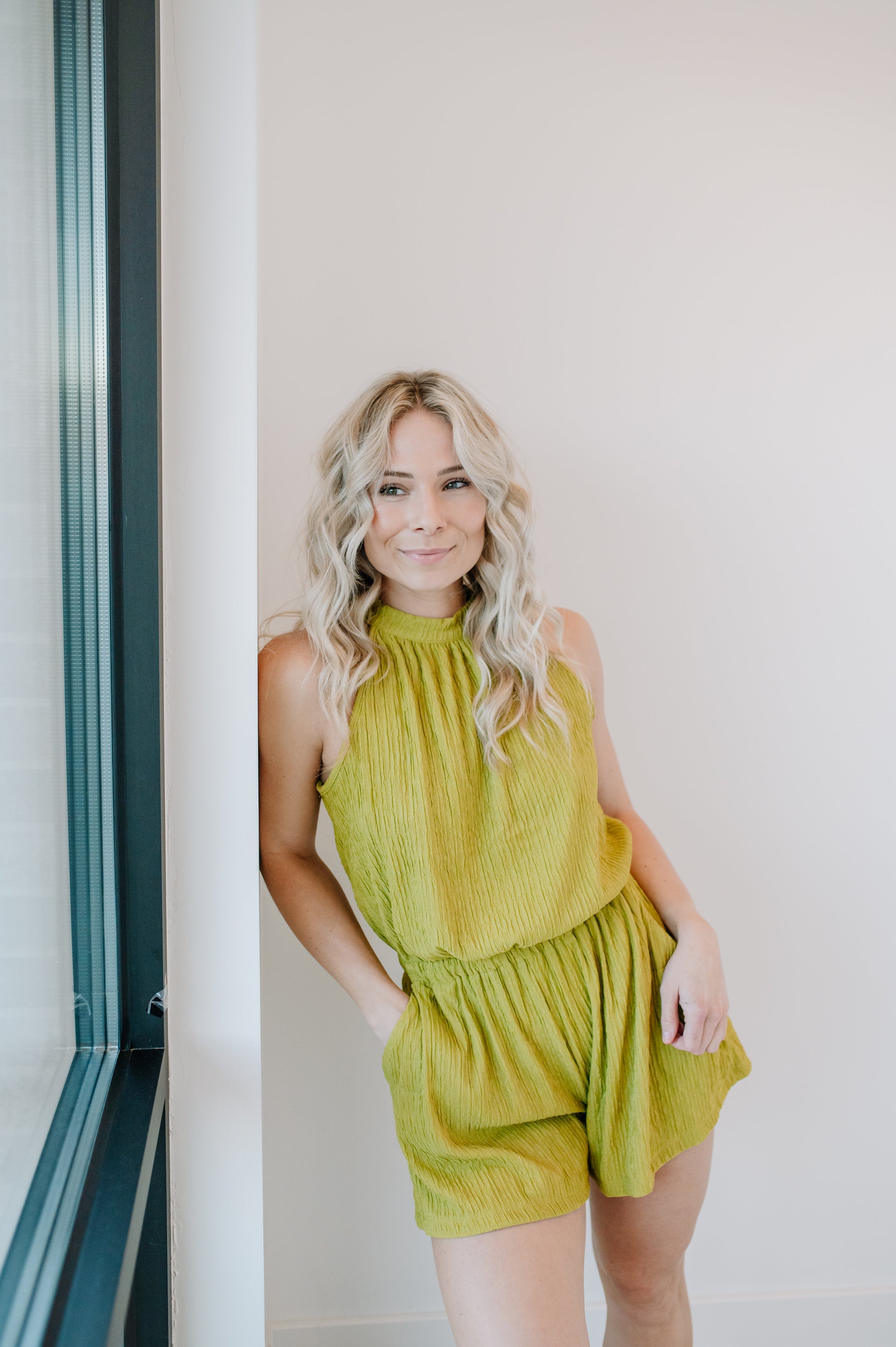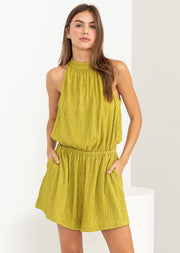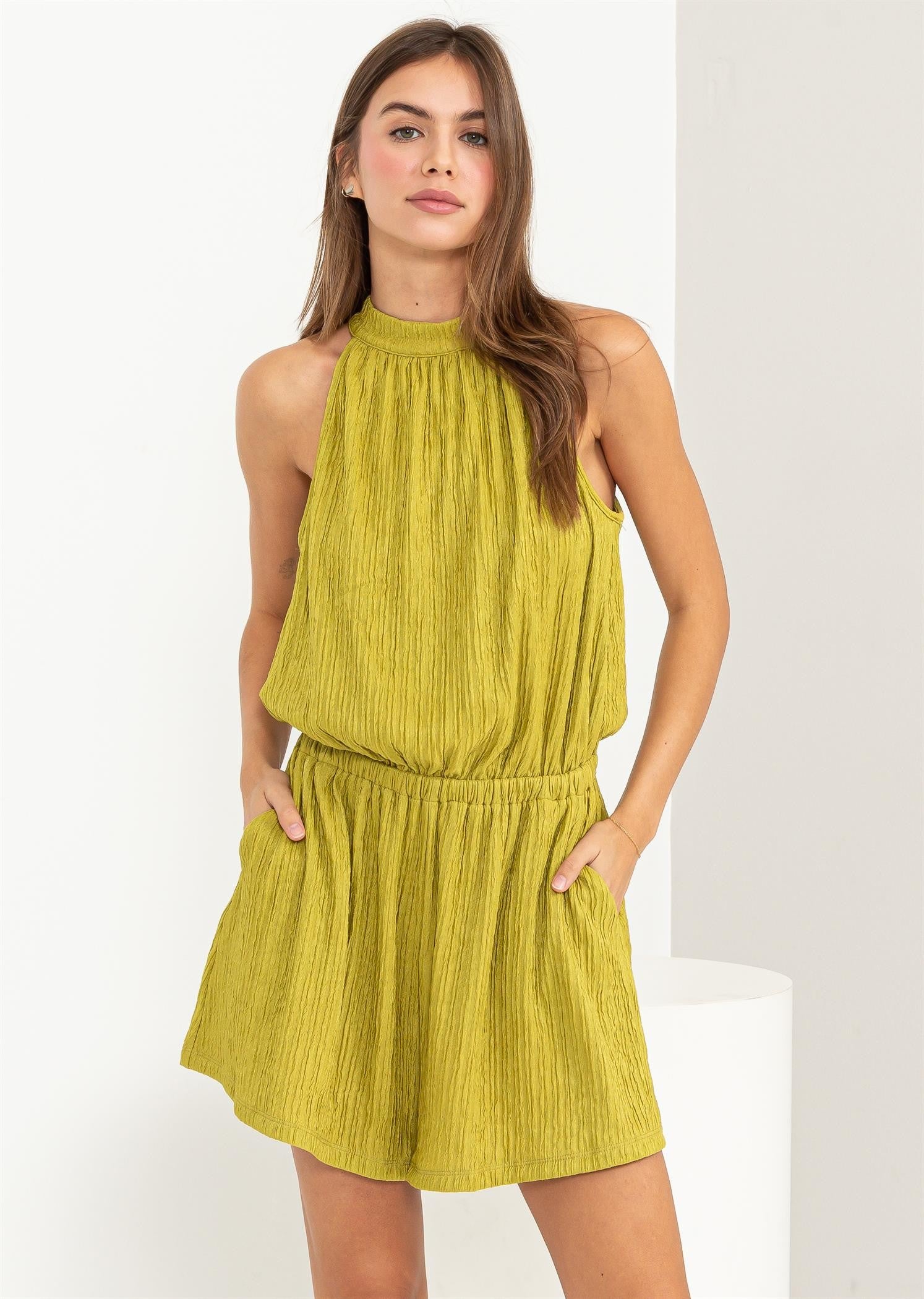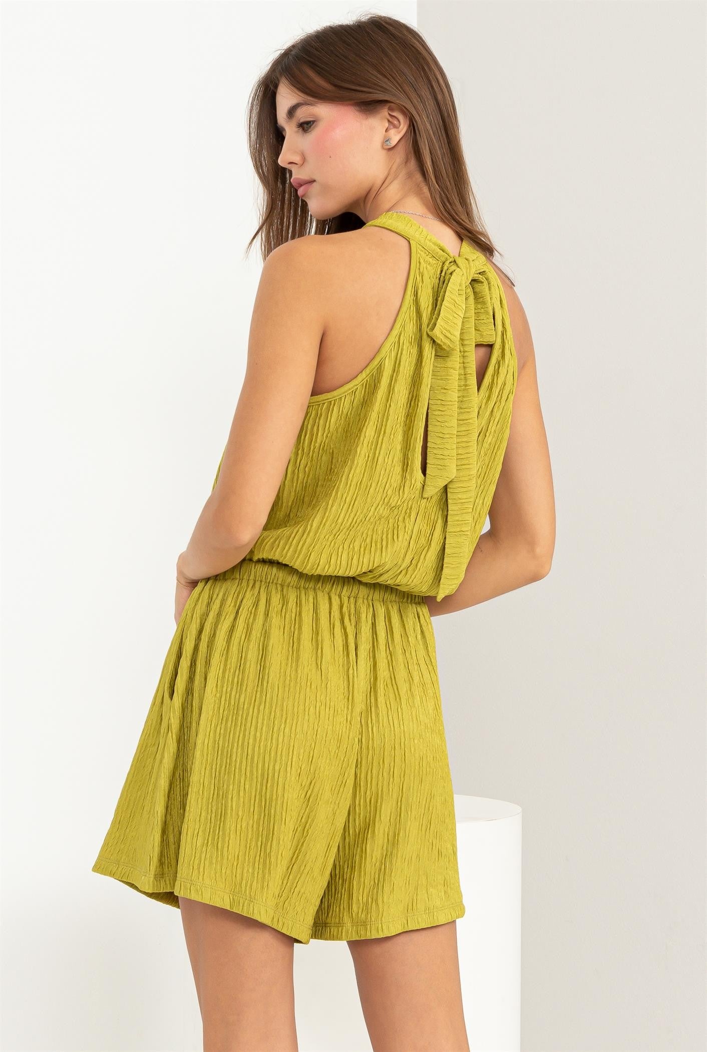 HAVE ALL EYES ON YOU WHEN YOU HEAD OUT WEARING THIS TEXTURED ROMPER. WITH A TIE-BACK HALTER NECK WITH KEYHOLE FOR EVERLASTING ROMANCE, THE RELAXED BODICE HAS A CINCHED WAIST TO DEFINE YOUR FEMININE STRUCTURE. BREEZY LEGS KEEP IT FLOWY AND CHIC. MODEL IS 5' 7" TALL, 32" CHEST, 25" WAIST AND 35" HIPS AND WEARING A SIZE SMALL IMPORTED. DESIGNED IN THE USA
