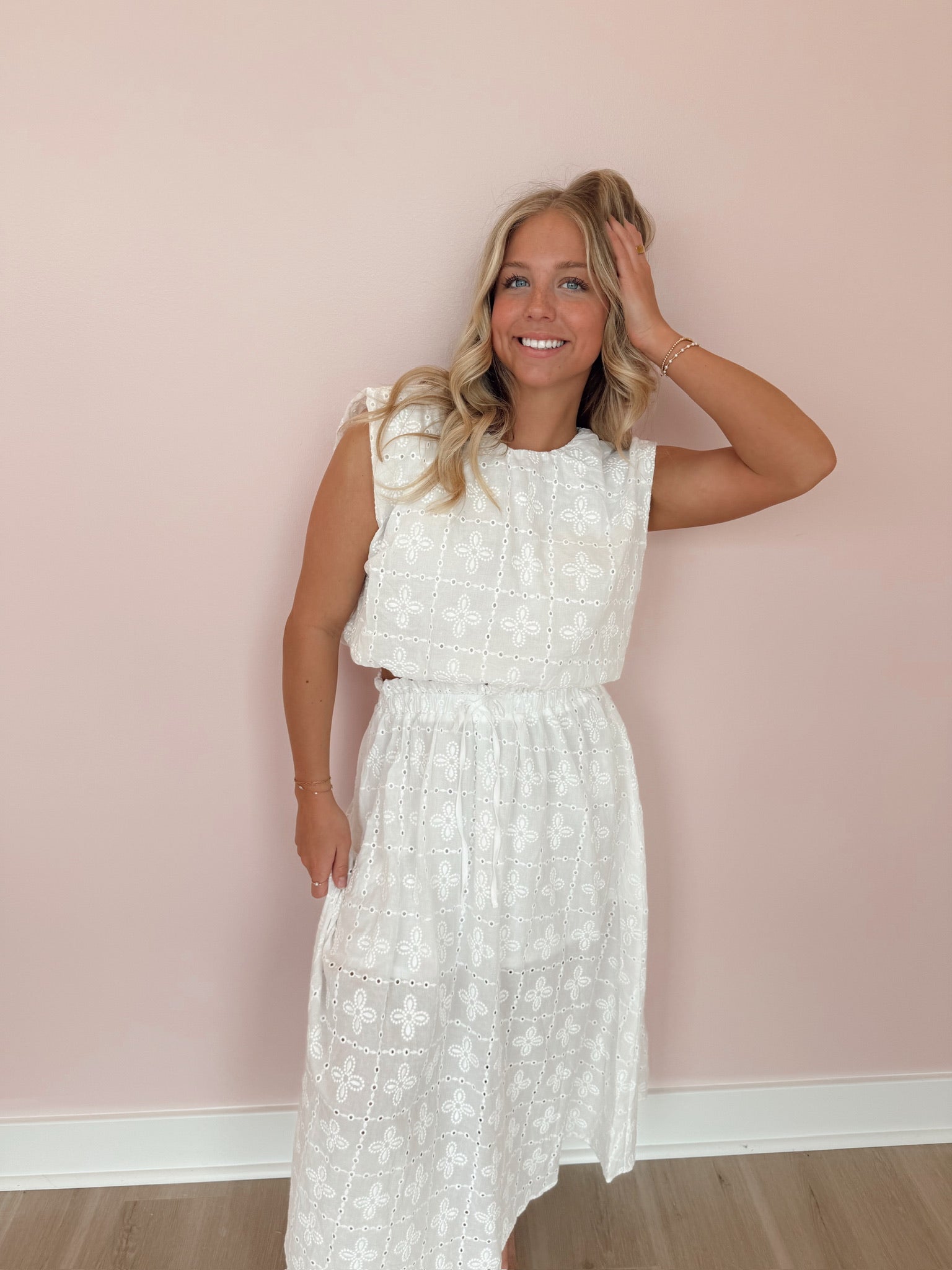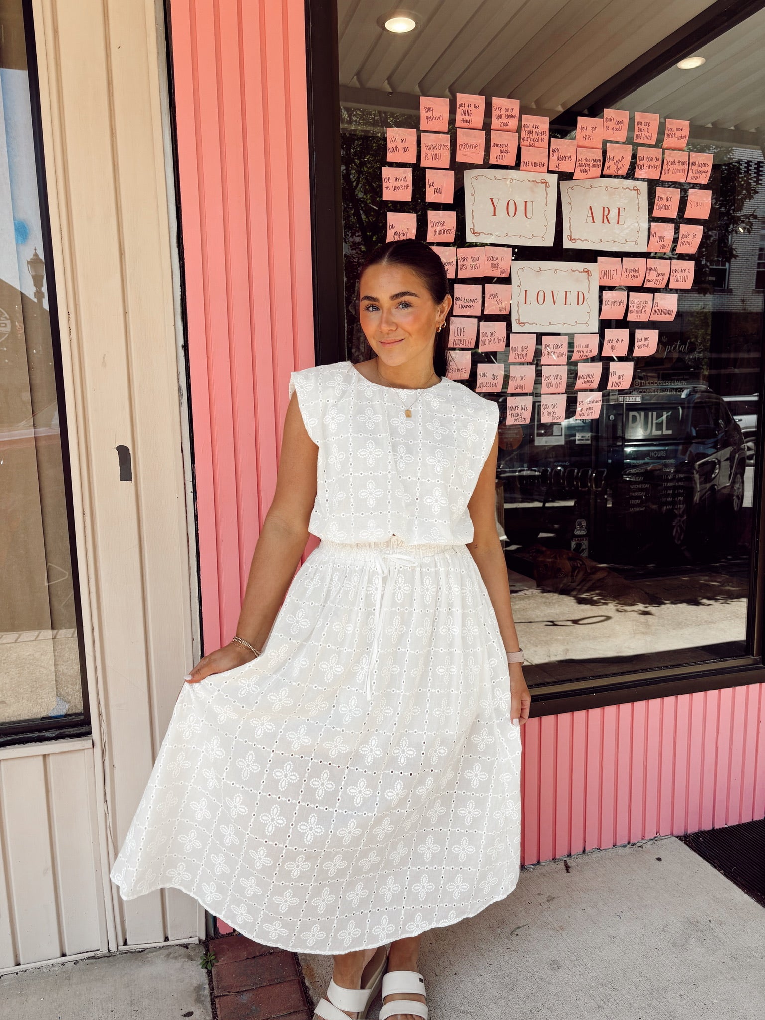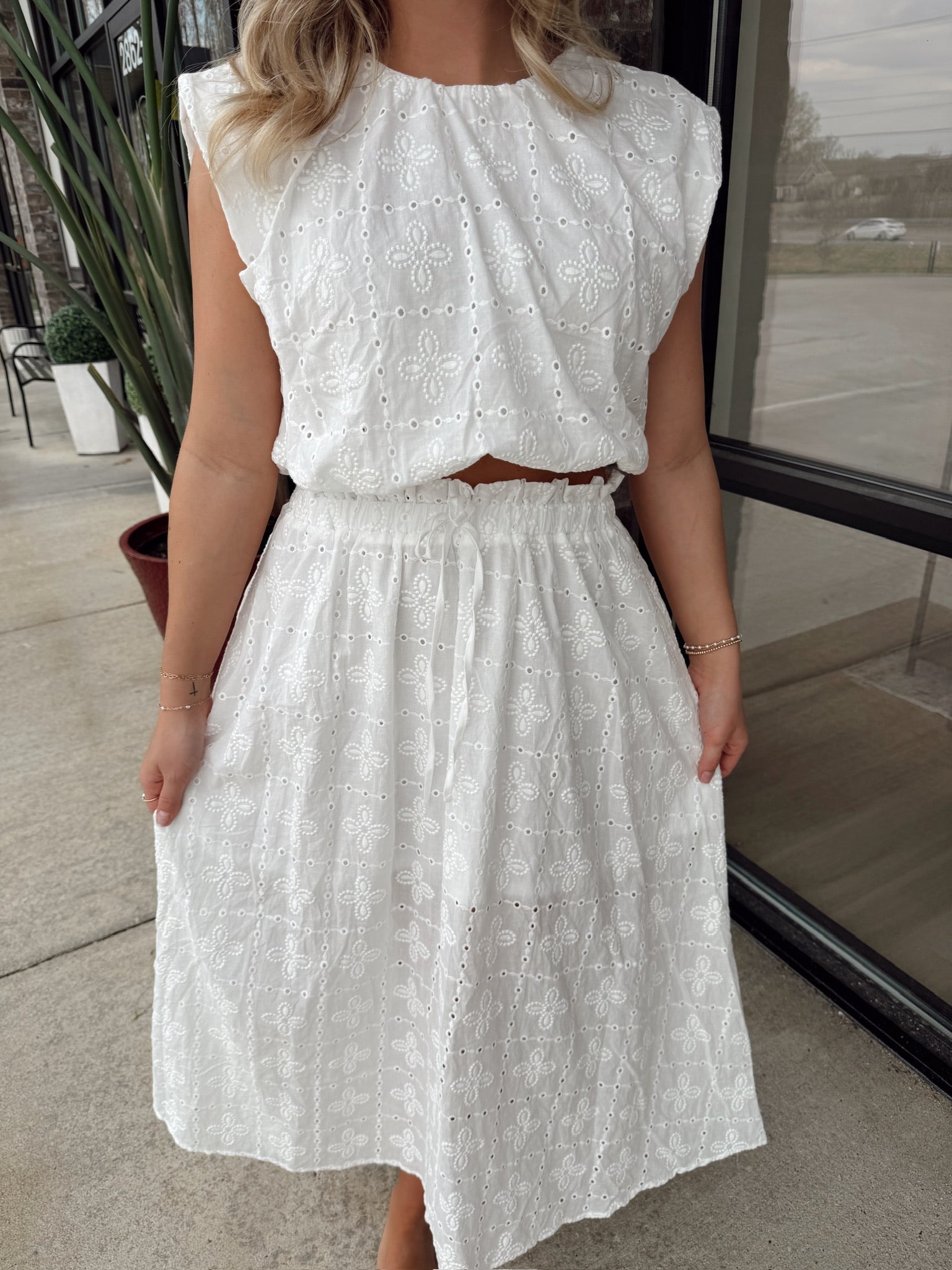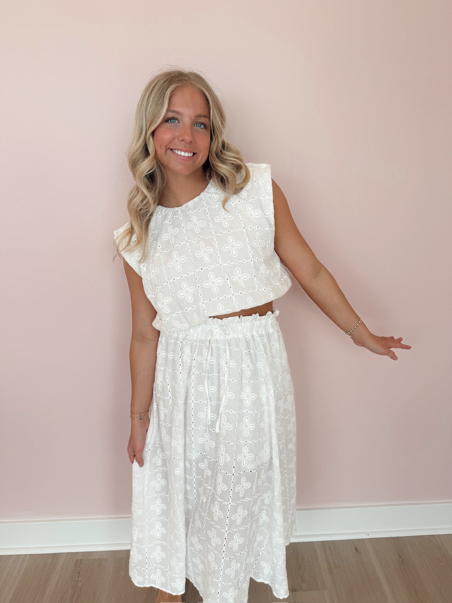High elastic waist Front tie drawstring detail Ruffle trim detail Eyelet pattern Lined Solid Midi skirt Shell: 100% cotton Contrast: 100% cotton Lining: 100% polyester