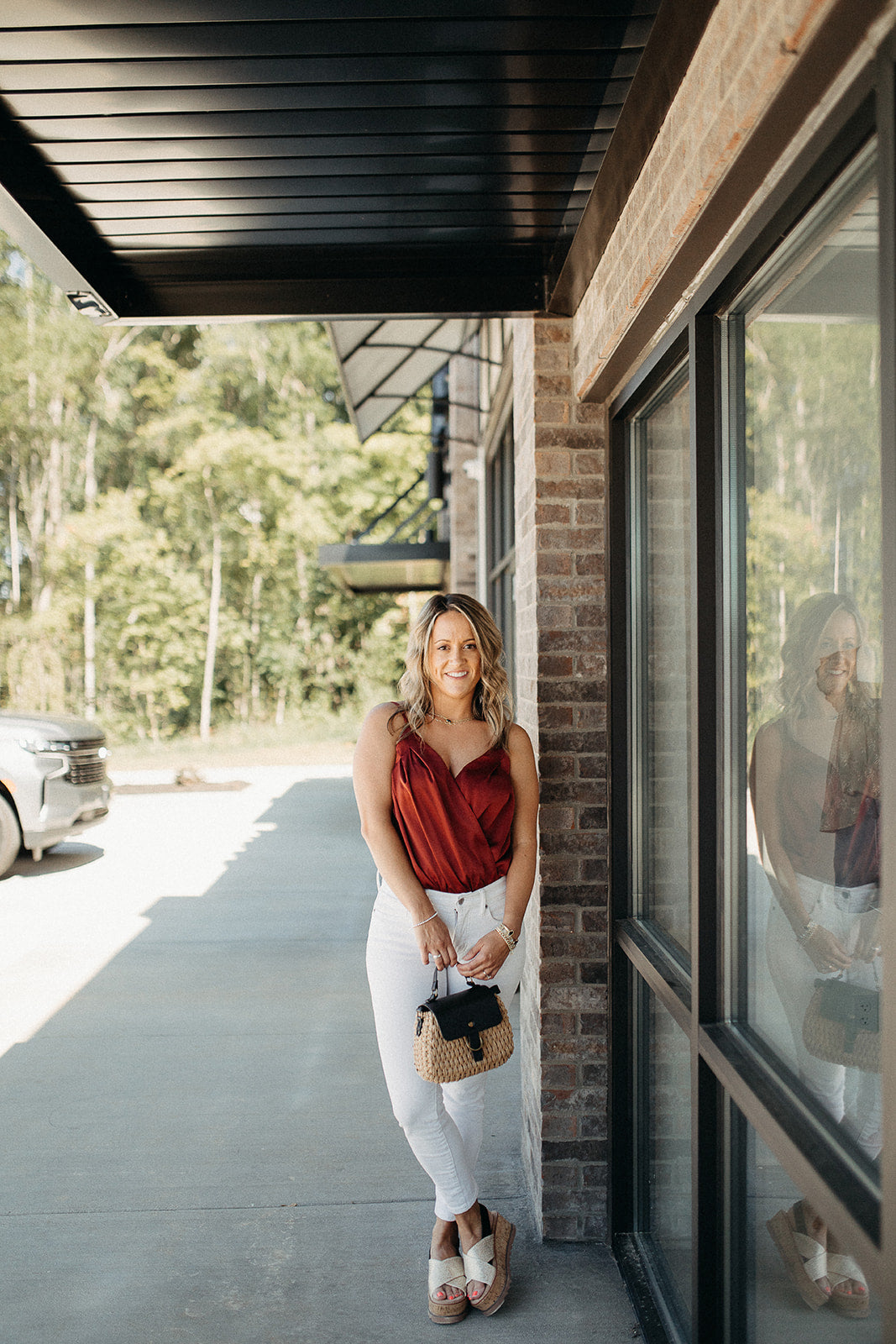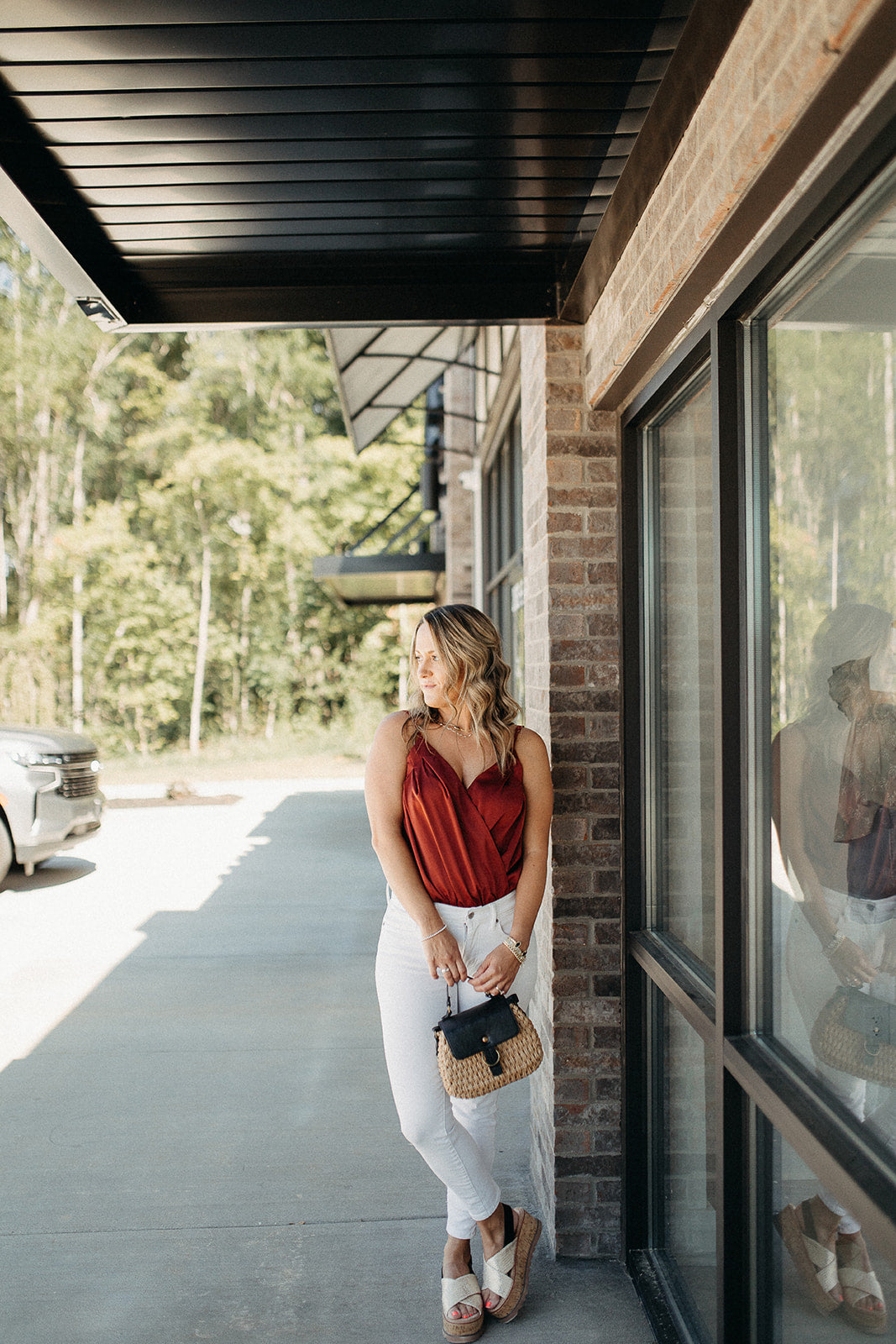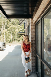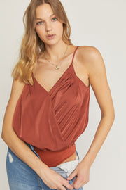 Solid v-neck spaghetti strap bodysuit featuring concealed button closure at front. Adjustable straps. Snap button closure. Unlined. Woven. Non-sheer. Lightweight.