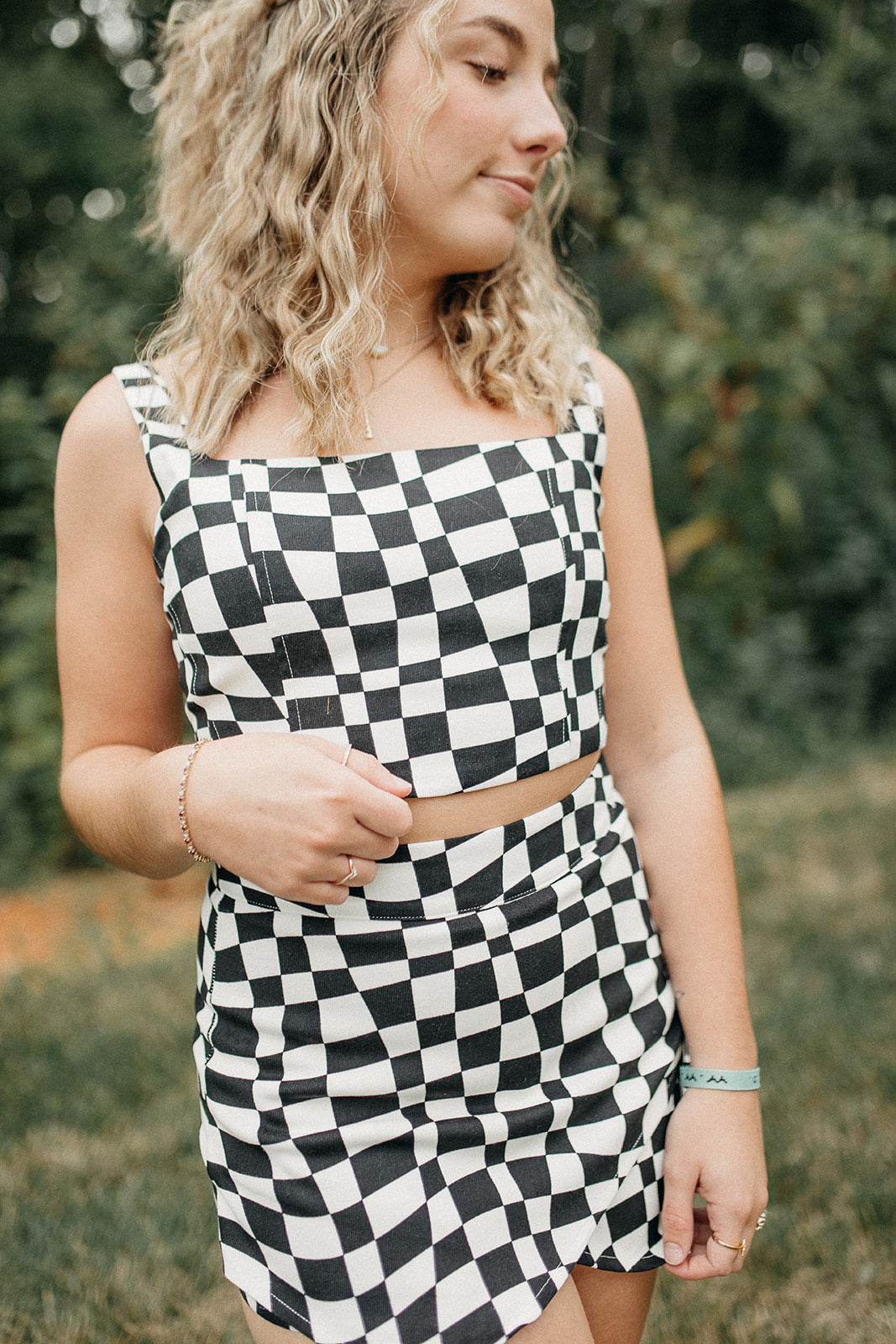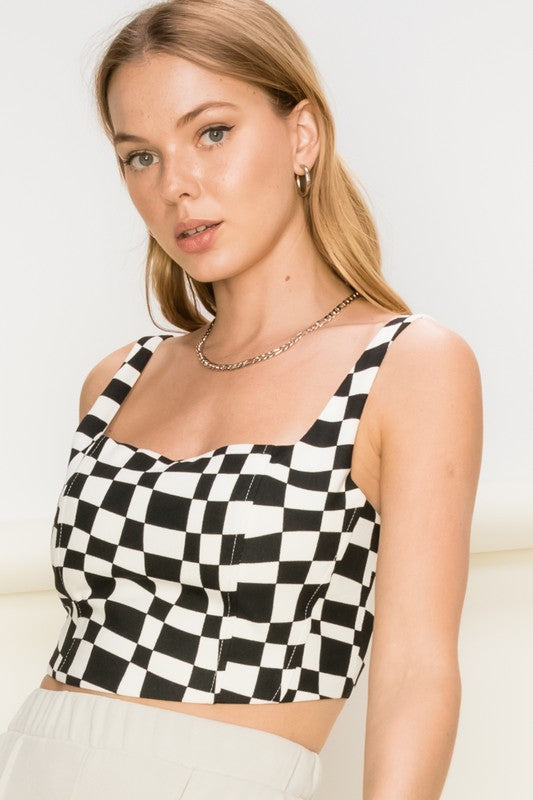 WE KNOW YOU'LL GO HEAD OVER HEELS FOR THIS EXQUISITE TOP! FASHIONED WITH AN ALL-OVER CHECKERED PRINT, A TIMELESS SQUARE NECKLINE IS SUPPORTED BY THICK SHOULDER STRAPS THAT ARE ATTACHED TO A FIGURE-SKIMMING BODICE WITH ROUND HEM. 97% POLYESTER 3% SPANDEX IMPORTED.