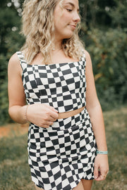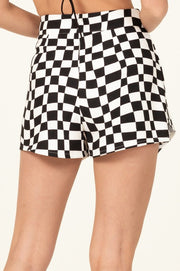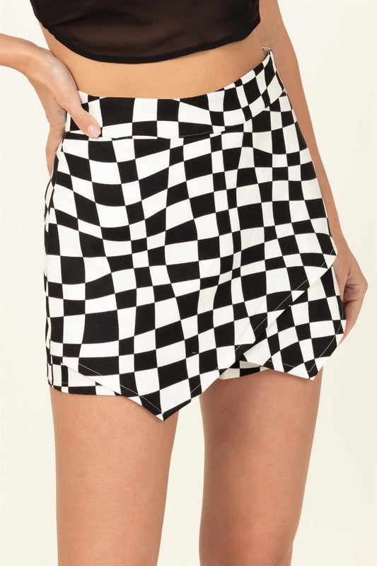 LOOK LIKE A CLASSY MISSY IN THIS EYE-CATCHING SKORT! DISPLAYING A CONTRASTING CHECKERED PRINT, IT IS TAILORED WITH A TRENDY HIGH-RISE SILHOUETTE THAT WILL WRAP AROUND YOUR HIPS BEAUTIFULLY. IT ENDS AT A SEXY ASYMMETRICAL MINI HEM 97% POLYESTER 3% SPANDEX.