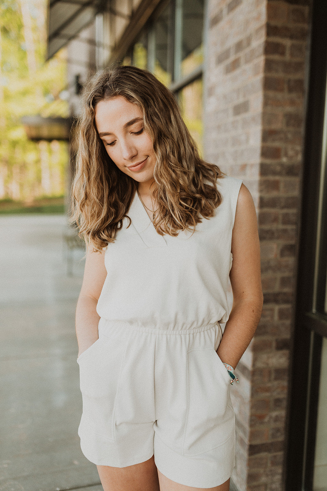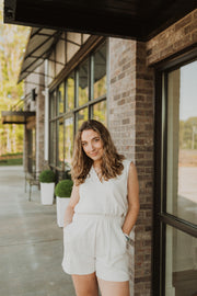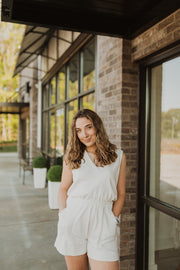 COTTON SLEEVELESS ROMPER WITH POCKETS - ELASTIC WAIST - RIBBED V-NECK TOTAL BODY LENGTH: 17.5"(FRONT TOP), BUST: 38", INSEAM: 4" approx. - MEASURED FROM SMALL * BRIGHT PINK FABRIC CONTENTS: 60% COTTON 40% POLYESTER