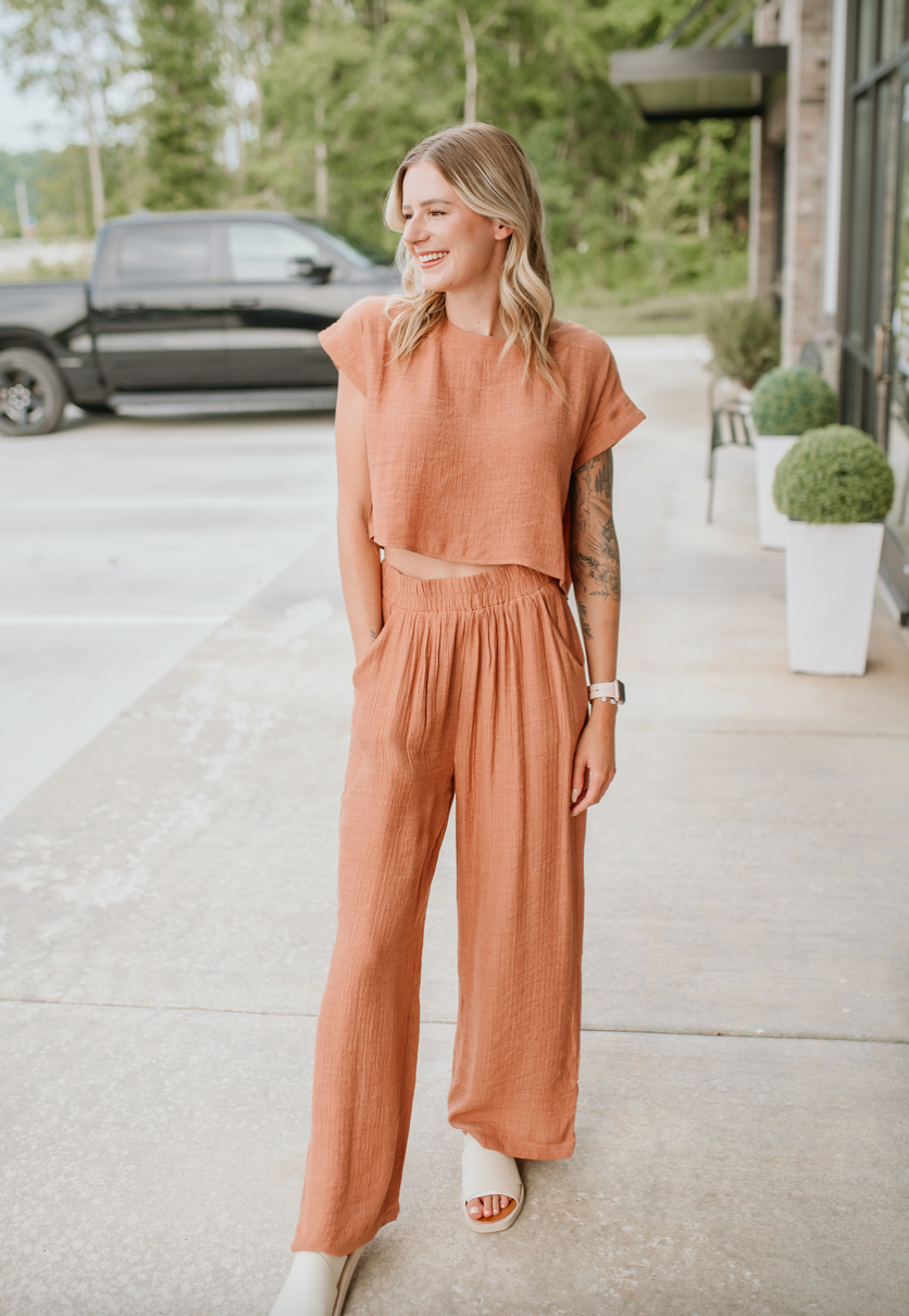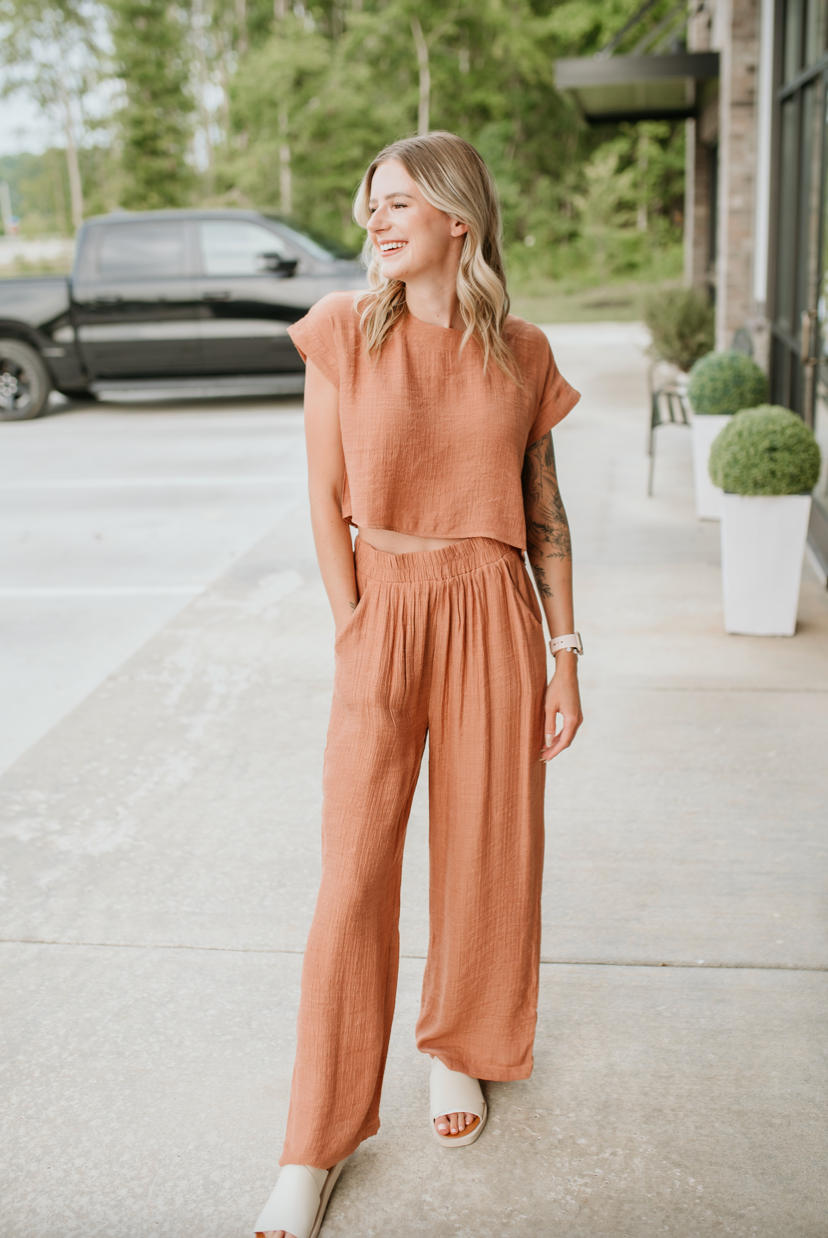 ELASTIC WAIST BAND - WIDE LEG - FULL LENGTH - SOLID PRINT - TEXTURE FABIRC - 64%RAYON, 36%POLYESTER