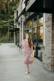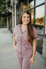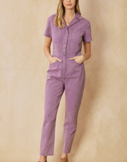 Denim utility jumpsuit featuring pockets at bust. Pockets at side. Single pocket at back. Button closure and zipper at front. Elastic waist at back. Unlined. Woven. Non-sheer. Lightweight.