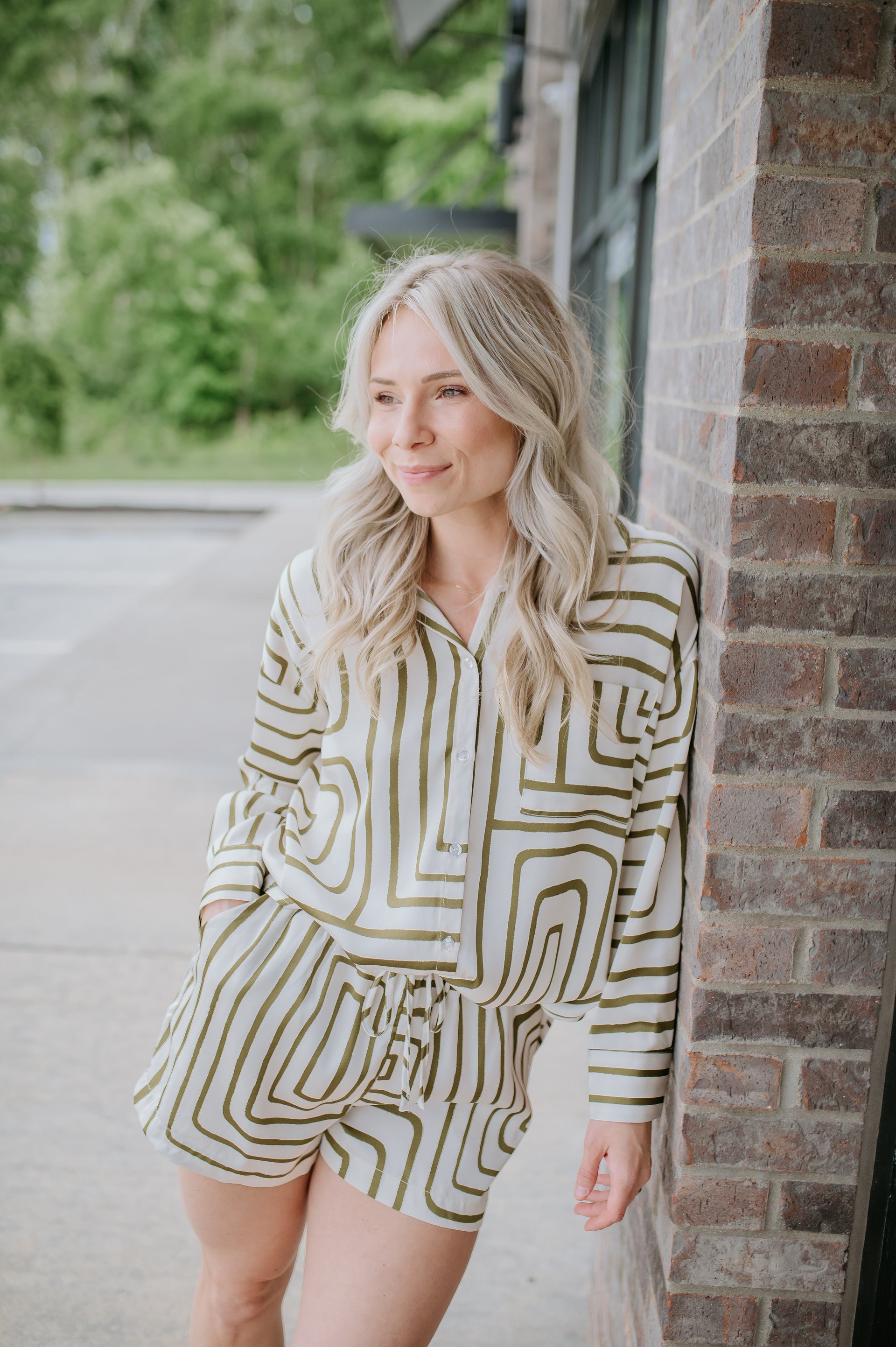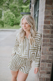 HIGH WAISTED ELASTICIZED WAIST DRAW STRING GEOMETRIC PRINT MINI SHORTS 100% POLYESTER