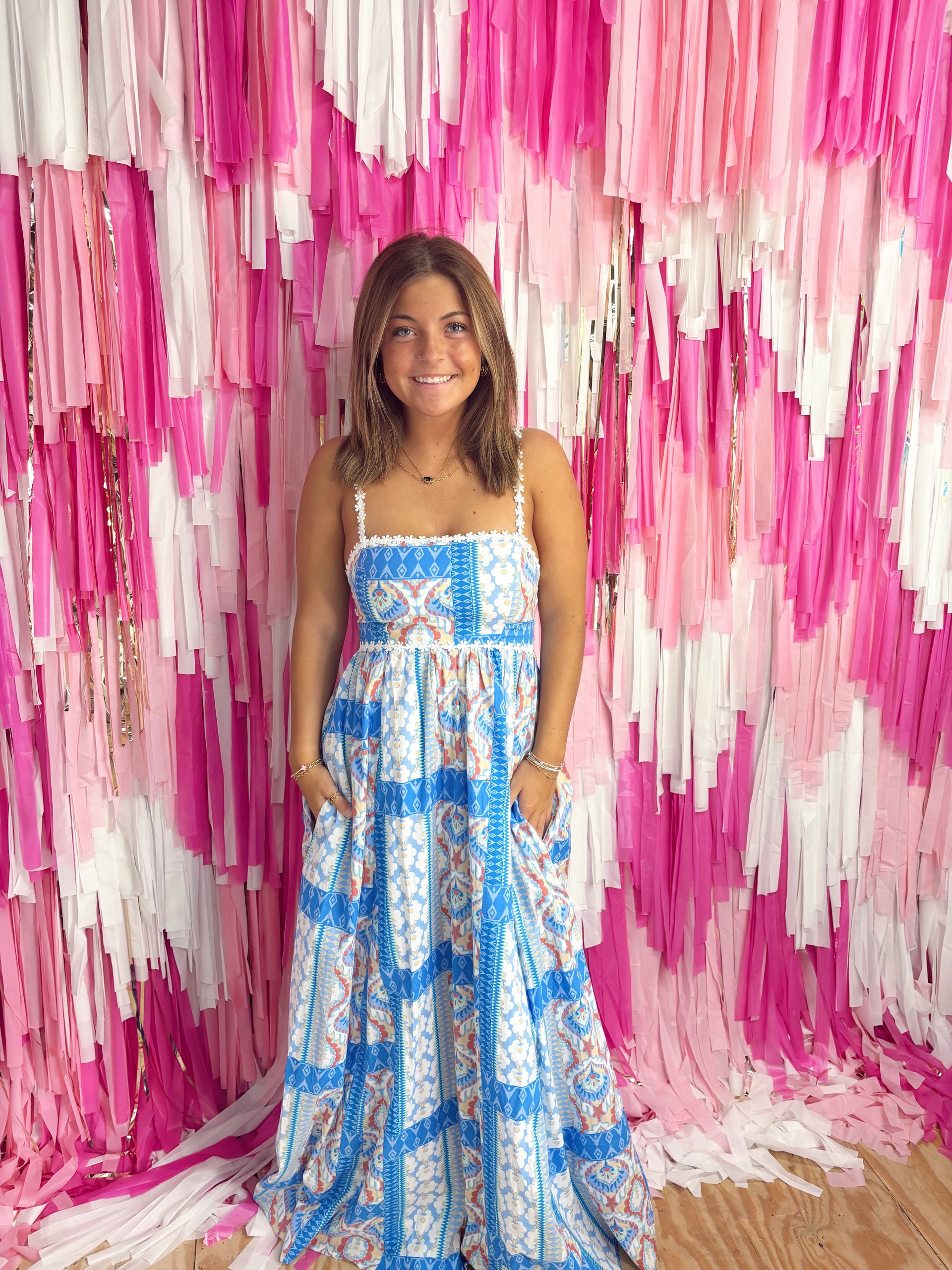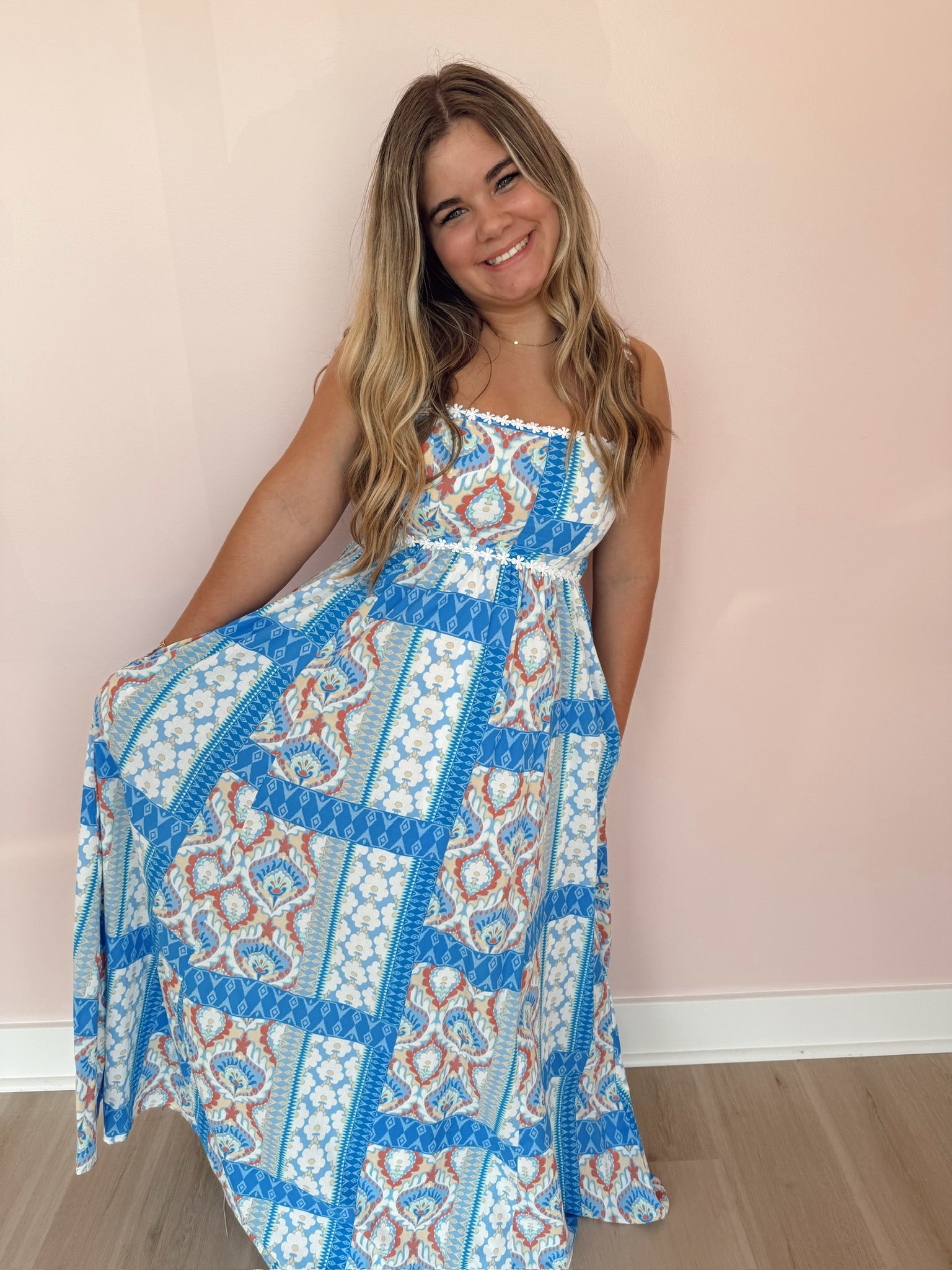 A printed woven maxi dress featuring straight neckline with lace trim, lace shoulder strap, full skirt and smocked back bodice Details: Self : 100% Cotton Lining : 100% Polyester