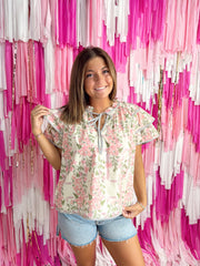 A look like this flutter sleeve top has endless amounts of charm! Lightweight woven fabric (with a floral print throughout) shapes a ruffled neckline with a keyhole and tying detail. Breezy, relaxed bodice is framed by tiered ruffle flutter sleeves. Contrast striped binding lines the neckline, sleeves, and hem. + Flutter sleeve contrast binding top + Ruffled neckline with keyhole and tying closure + Contrast binding trim on neckline, sleeves, and hem + Tiered ruffle short sleeves + Relaxed fit