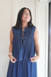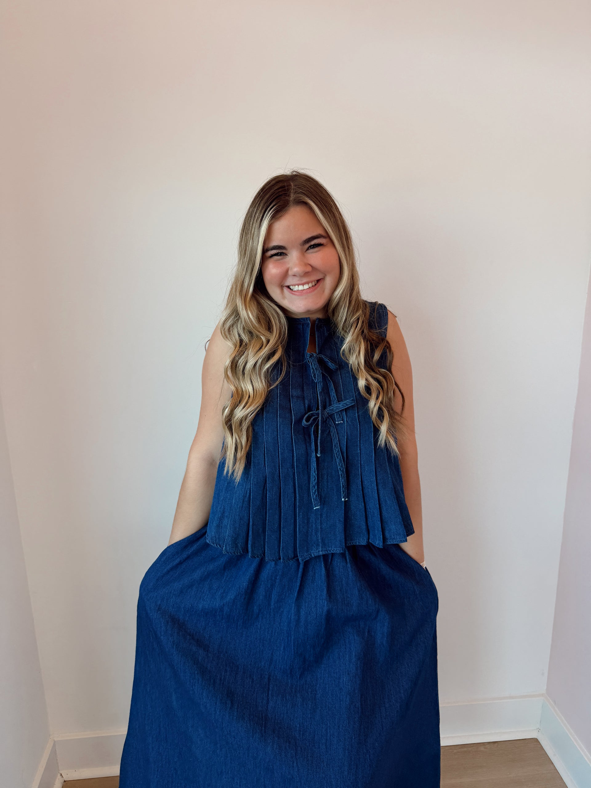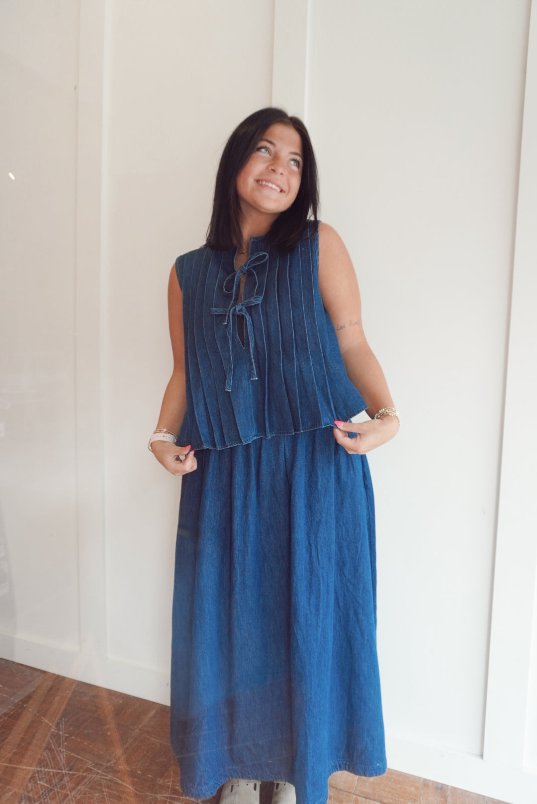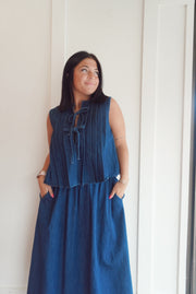 Front tie pin tuck detail sleeveless denim blouse with a matching elastic waist denim maxi skirt