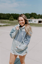 A solid pullover hoodie with contrasting woven panels.This long sleeve pullover features a drawstring hood, raw edging details, side slits, and a kangaroo front pocket.