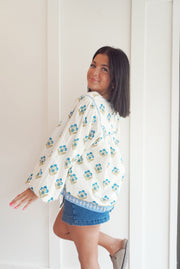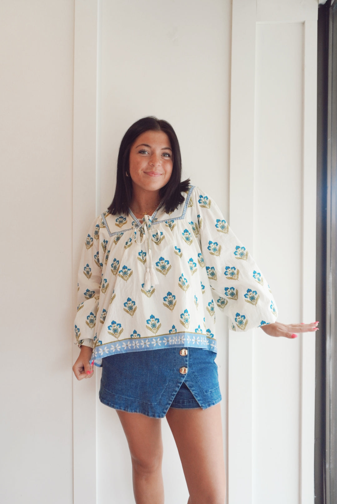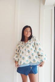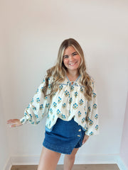 A printed woven top featuring a V neckline with tie, yoke and long sleeve with smocked cuff