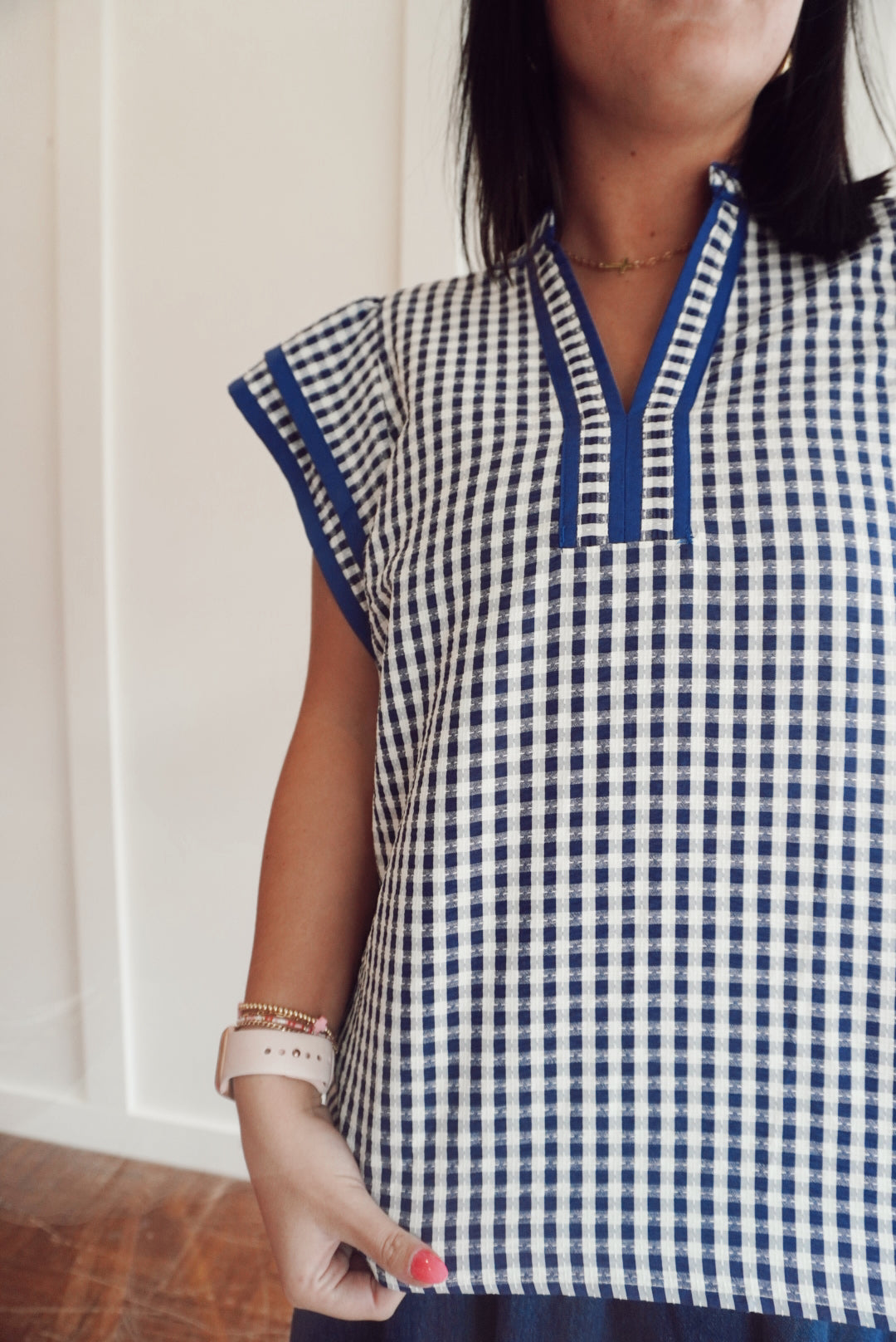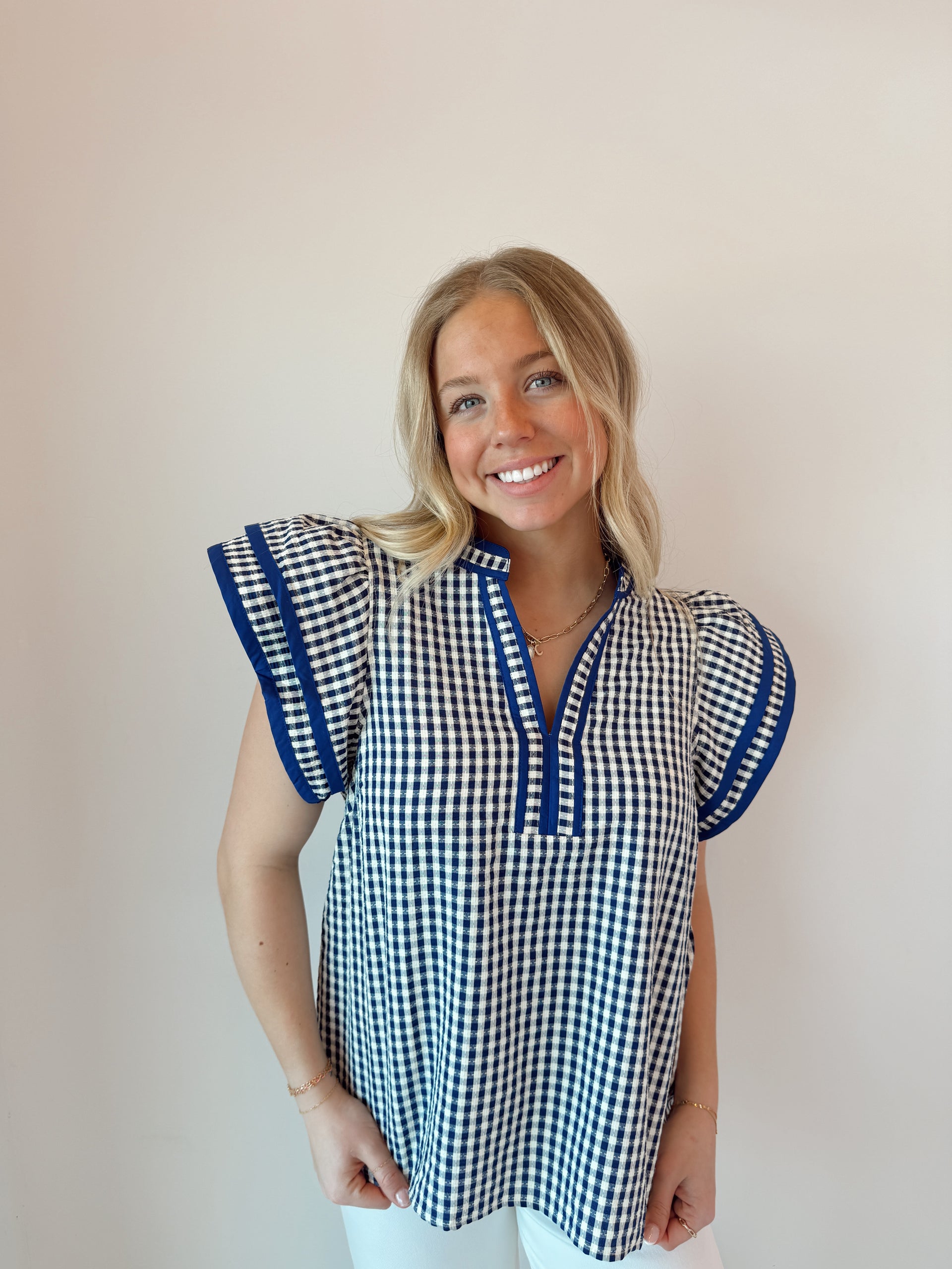 A navy and white checkered short sleeve blouse with ruffle sleeves.