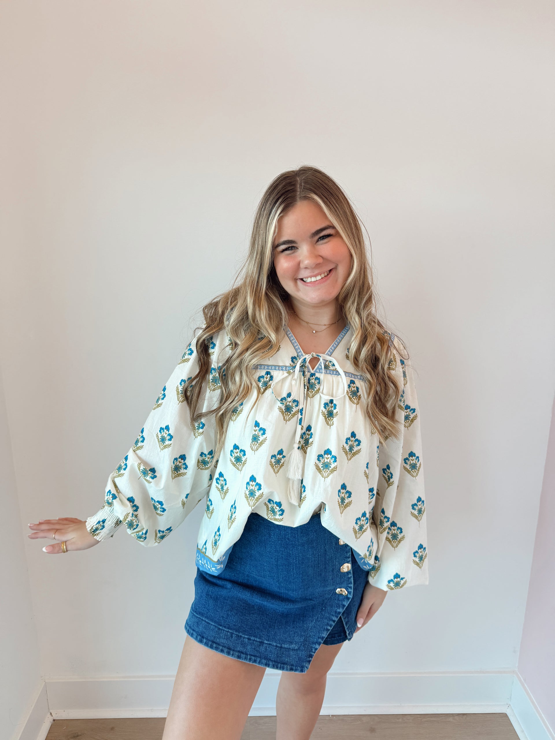 A washed denim skort with front button detail and side zipper closure