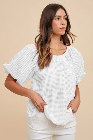 GINGHAM CHECK BUBBLE SLEEVE WOVEN BLOUSE - GINGHAME CHECK WOVEN FABIRC - SHORT BUBBLE SLEEVE - FULL LINED - ROUND NECKLINE - RELAXED FIT