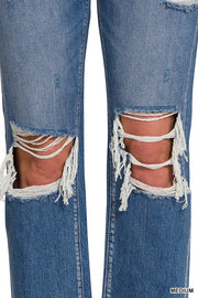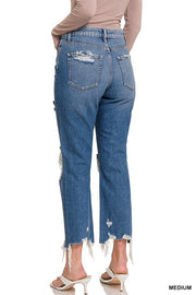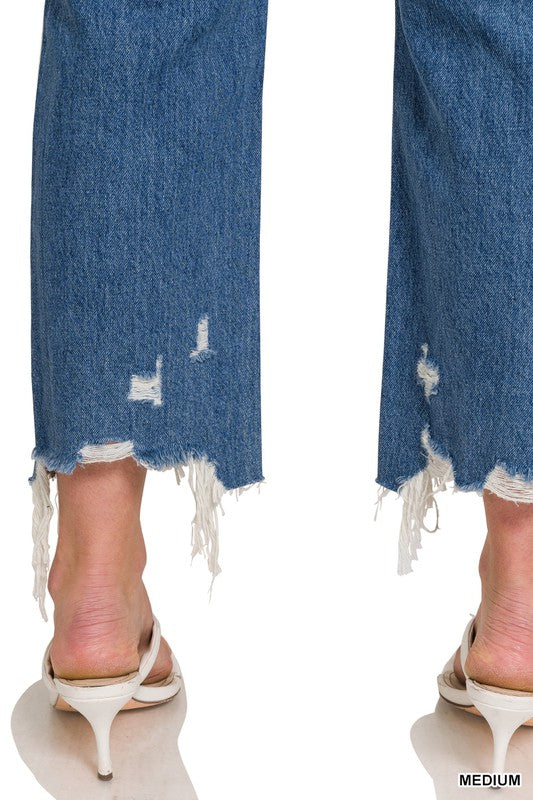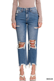 DISTRESSED STRAIGHT CROP DENIM PANTS FRONT RISE: 11", INSEAM: 27" approx. LEG OPENING: 15.5" approx. MODEL IS 5'9" WEARING SIZE 27 ** COLOR MAY VARY SLIGHTLY DUE TO MONITOR RESOLUTION