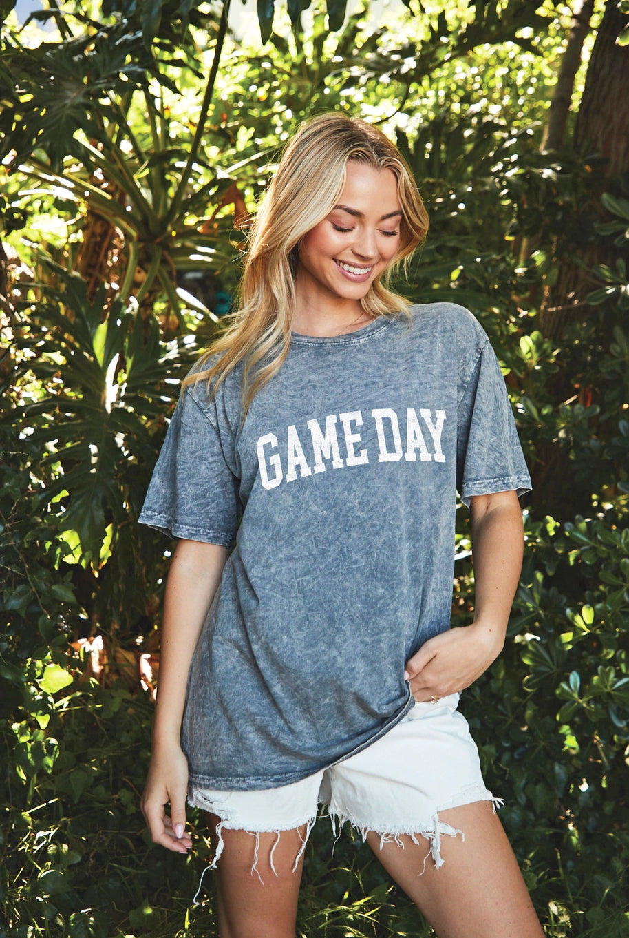 Game day oversized mineral washed graphic top -100% mineral washed for silky smooth texture. -Hand printed with discharge water based ink. -Oversized boxy fit. -100% premium cotton. Pre-shrunk ringspun. -All items are slightly different because of the dying process of the garment.