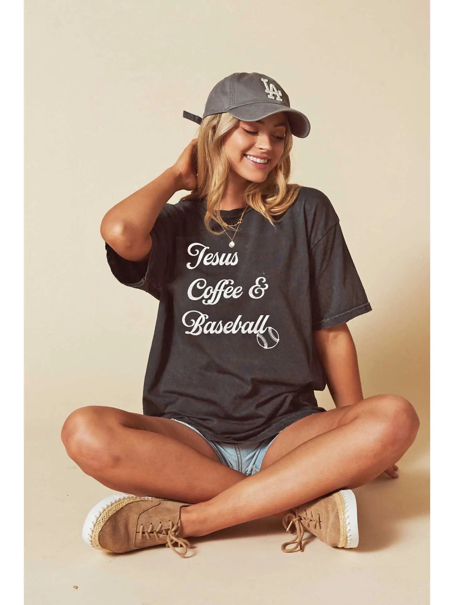 JESUS COFFEE AND BASEBALL Mineral Washed Graphic Top -100% Premium Cotton Jersey. -Relaxed unisex fit. -Screen Printed with water based ink. -All items are slightly different because of the dying process of the garment.