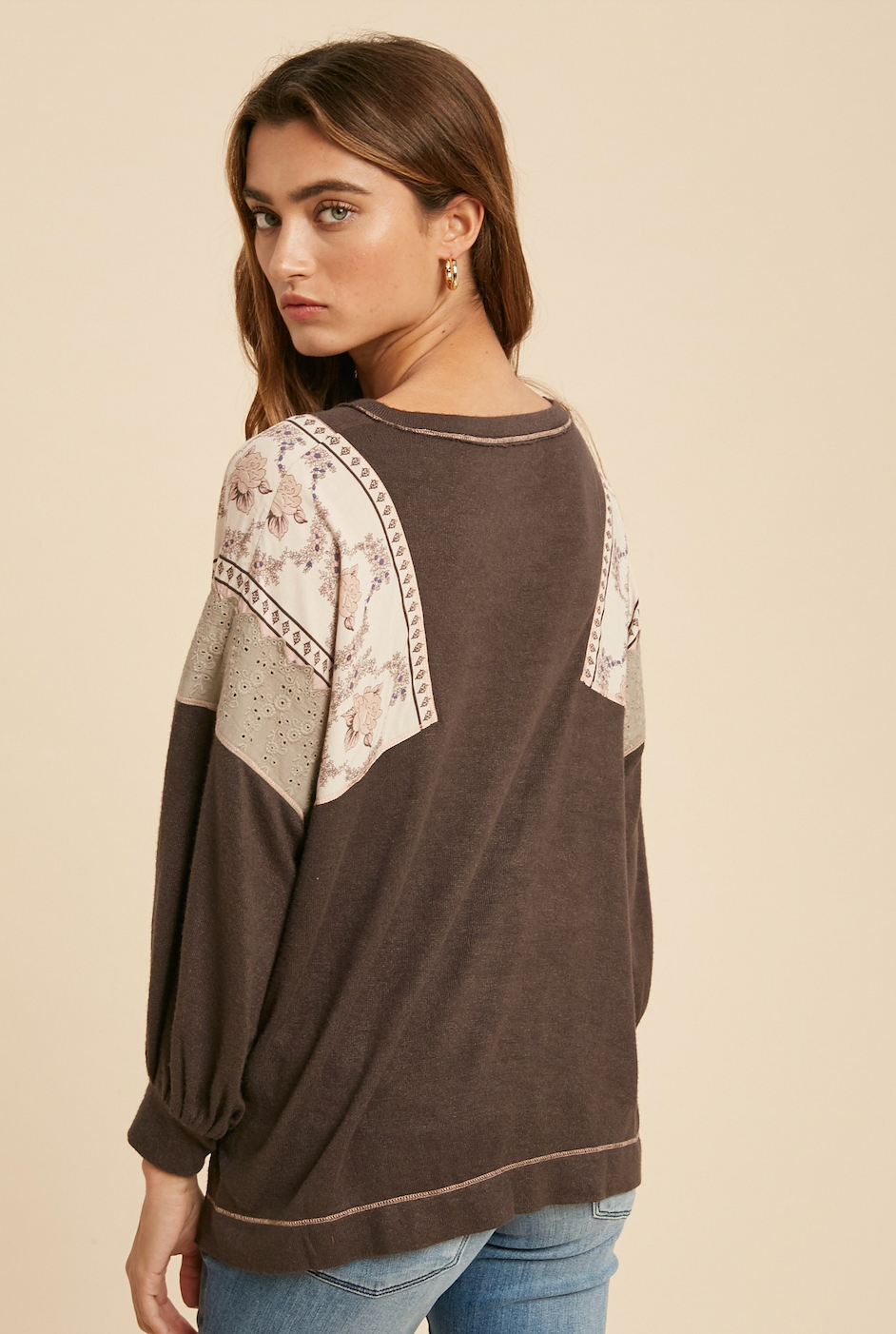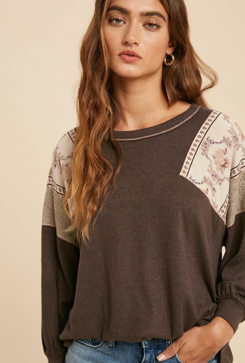 LOVELY CONTRAST BOHO KNIT TOP FEATURING A SUBTLE FLORAL PRINT SHOULDER CONTRAST WITH EYELET CONTRAST. CONTENTS: SELF: 31% POLYESTER 48% RAYON 21% NYLON, CONTRAST: 100% RAYON, TRIM: 100% COTTO