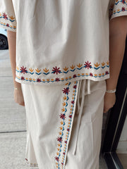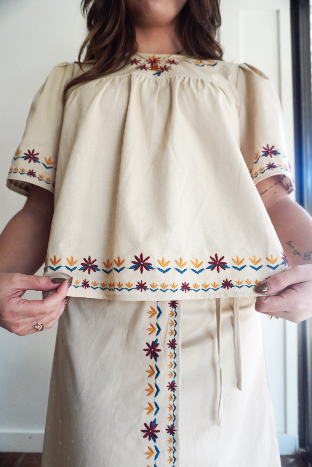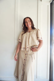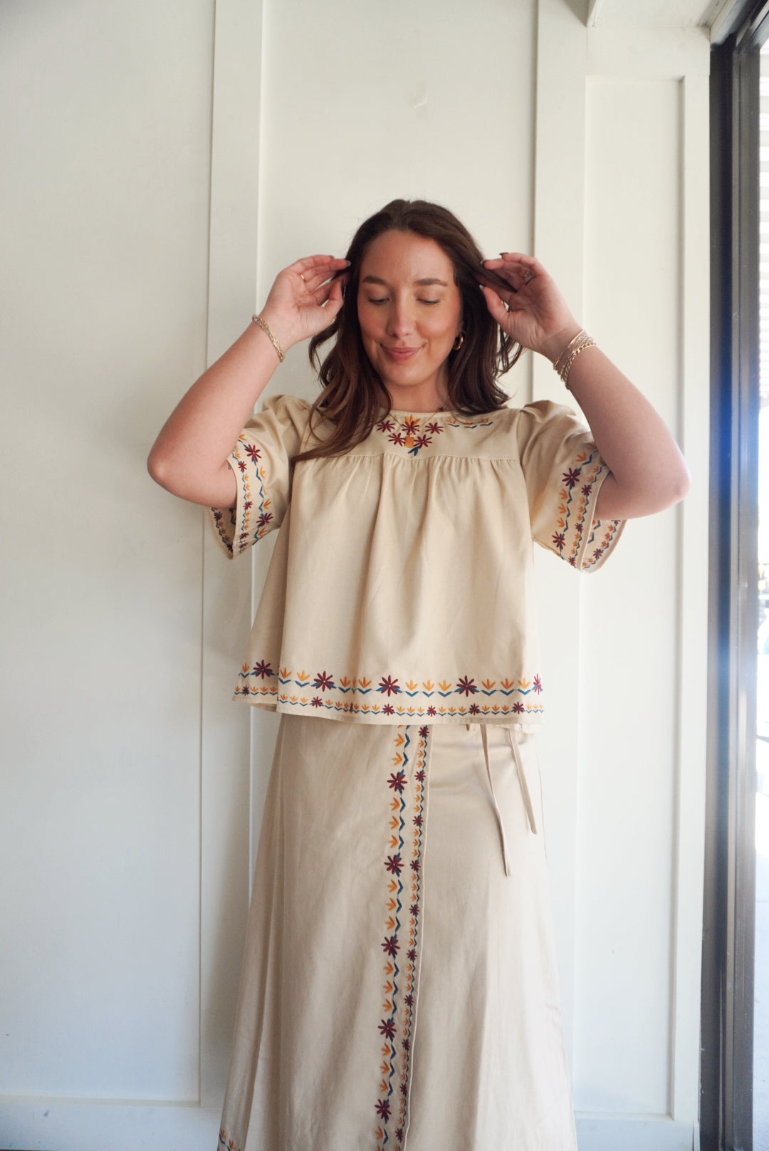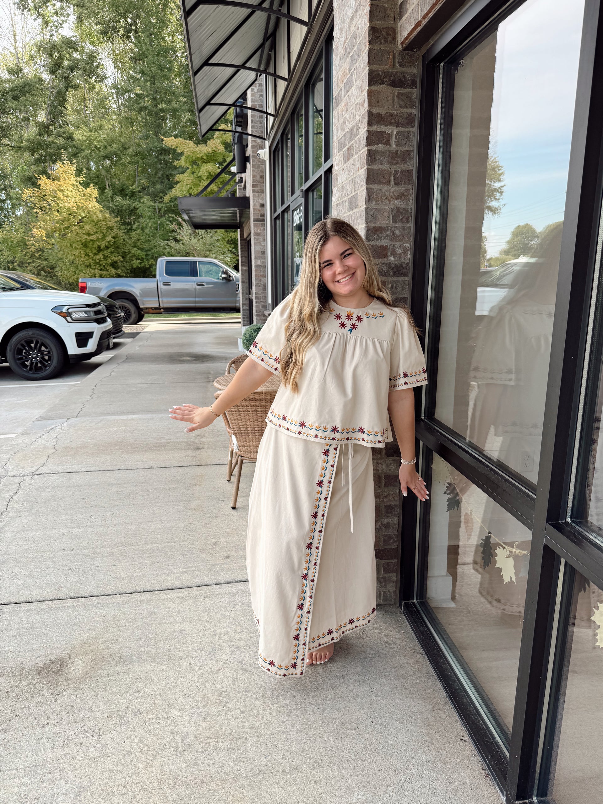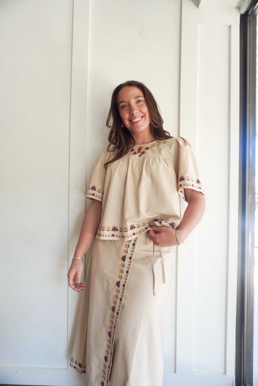 Embroidered floral peasant blouse paired with an embroidered hem wrap maxi skirt